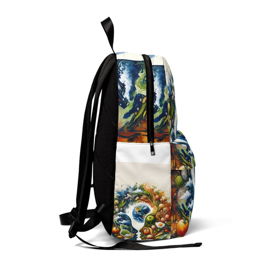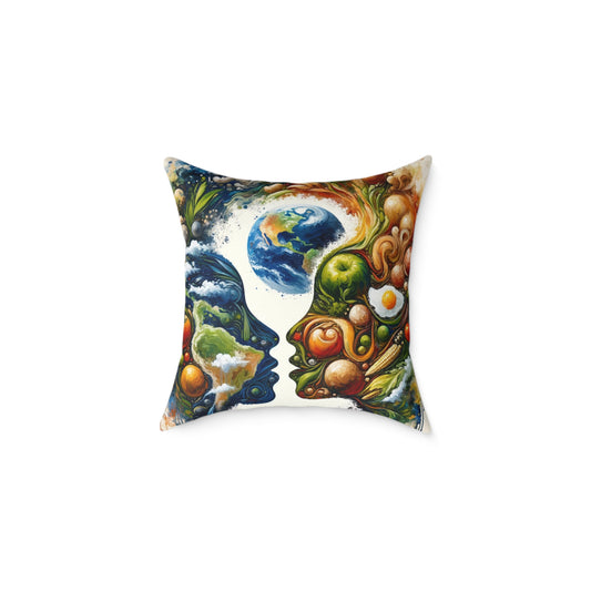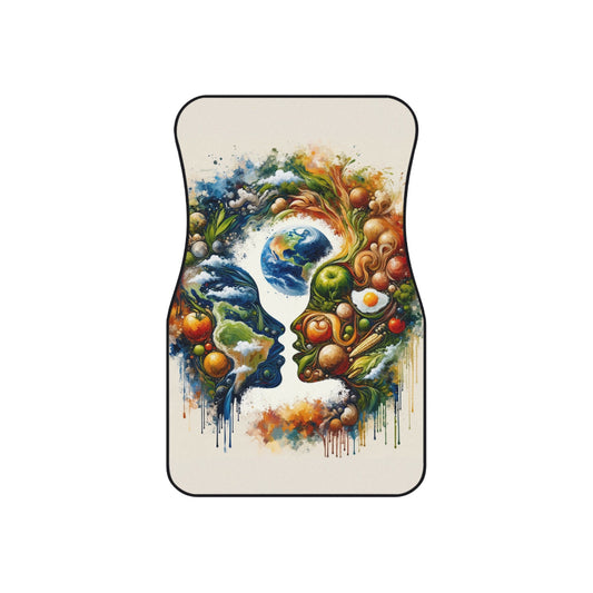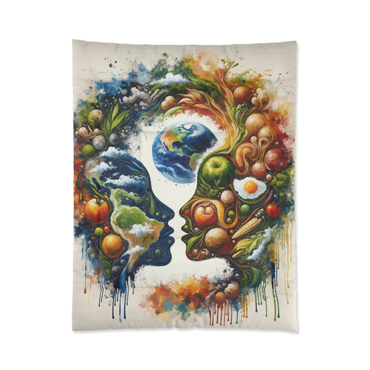 Earthly Dialogue Feast is a vertical image that embodies the Tachism style, an abstract painting method. This artwork pulsates with a rich color palette, predominantly earth tones and vibrant blues, engulfing the observer in a harmonious collision of color and vitality that symbolically interprets the notion that our dietary choices engage in an ongoing conversation with the Earth. At the heart of the composition, two distinct profiles face each other, their features masterfully rendered with elements of nature. One side presents lush greenery, grains, and a bounty of fresh vegetables, illustrating the earth s generosity. At the opposite side, we see these elements tailored into the harvest, with an abundance of vegetables and a symbolic egg, underscoring the connection between human consumption and natural resources. These profiles are not alone; they are cradled by a cosmic backdrop where a meticulously detailed Earth floats in the center, reinforcing the global implications of food choices. The planet s blues and greens echo the colors found in the profiles, reinforcing the integrated narrative. The fluidity of Tachism is evident in the way paint seems to drip and flow down the canvas, representing the organic and unstructured nature of the conversation between humans and their environment. This technique adds a dynamic texture, encapsulating the serendipity of nature and the culinary arts. Overall, the image is a resounding visual feast, provoking reflection on the impact of our dietary decisions on the global ecosystem.