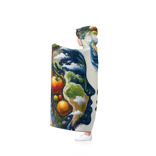 Earthly Dialogue Feast is a vertical image that embodies the Tachism style, an abstract painting method. This artwork pulsates with a rich color palette, predominantly earth tones and vibrant blues, engulfing the observer in a harmonious collision of color and vitality that symbolically interprets the notion that our dietary choices engage in an ongoing conversation with the Earth. At the heart of the composition, two distinct profiles face each other, their features masterfully rendered with elements of nature. One side presents lush greenery, grains, and a bounty of fresh vegetables, illustrating the earth s generosity. At the opposite side, we see these elements tailored into the harvest, with an abundance of vegetables and a symbolic egg, underscoring the connection between human consumption and natural resources. These profiles are not alone; they are cradled by a cosmic backdrop where a meticulously detailed Earth floats in the center, reinforcing the global implications of food choices. The planet s blues and greens echo the colors found in the profiles, reinforcing the integrated narrative. The fluidity of Tachism is evident in the way paint seems to drip and flow down the canvas, representing the organic and unstructured nature of the conversation between humans and their environment. This technique adds a dynamic texture, encapsulating the serendipity of nature and the culinary arts. Overall, the image is a resounding visual feast, provoking reflection on the impact of our dietary decisions on the global ecosystem.