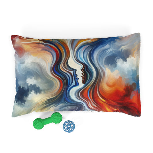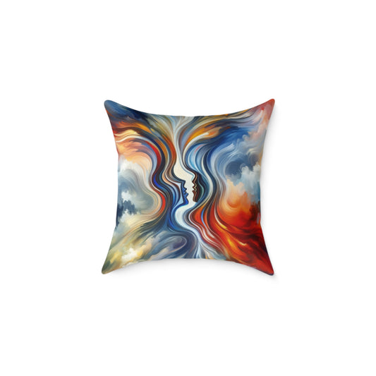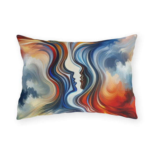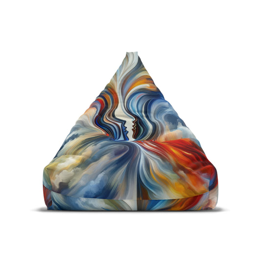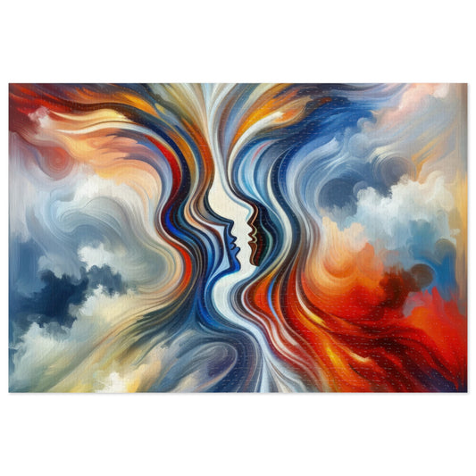 The image titled Convergent Abstract Unity is a striking piece of vertical Tachism style painting that symbolizes A Tipping Point in Togetherness . The abstract artwork captures the essence of a critical moment, expressed through a mesmerizing blend of colors and forms. At the heart of the painting, two silhouetted profiles face each other, forming a central focal point that suggests a connection between elements or individuals. Surrounding the profiles, swirling strokes of vibrant hues convey motion and convergence. On the left, a cool palette of blues and whites suggests a calm, possibly introspective space, evoking the sensation of clouds or a tumultuous sea. These shades transition smoothly into warmer tones of yellows, oranges, and reds on the right side, imparting a sense of passion, warmth, and dynamic energy. The duality of the color scheme, along with the fluid movement of the brushwork, gives a visual representation of the interaction between contrasting forces or emotions. The work visually implies a narrative of coming together, an amalgamation of differences creating a harmonious whole. It s a powerful expression of togetherness and the pivotal moments when separate elements unify to transcend their individuality. The Tachism technique adds to the intensity and depth of the piece, with its emphasis on spontaneity and abstraction, encouraging the viewer to explore the deeper meaning latent within the interplay of shapes and colors.