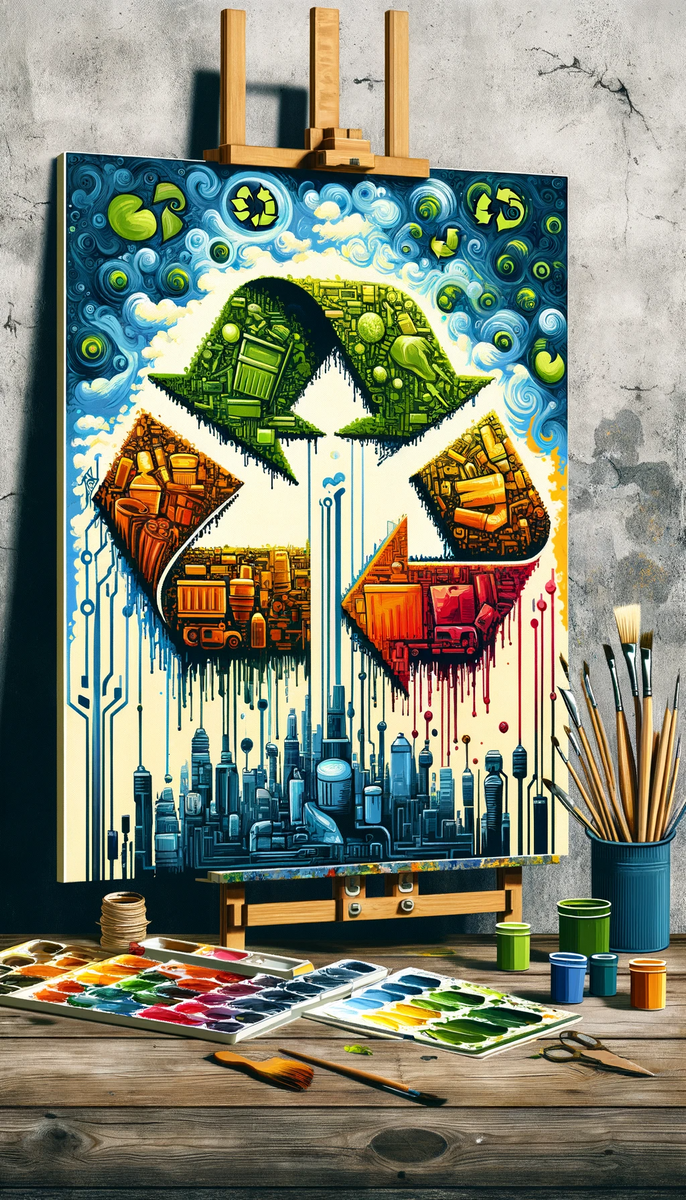 The image titled Upcycling Lifecycle Artistry is a vibrantly colored vertical artwork resting on an easel. It depicts an imaginative interpretation of the theme of Beyond Recycling: Upcycling as a Way of Life. Central to the composition is a series of triangular shapes forming a recycling symbol. Each triangle illustrates a different stage of upcycling: one triangle contains a lush green landscape crafted from electronic circuit boards, hinting at the rebirth of discarded technology into a new natural world. Another triangle is made of an array of amber-hued household items symbolizing the transformation of everyday waste. The third triangle drips with a myriad shades of brown, suggesting deteriorating waste merging into a new purpose. Drips from these triangles flow downwards, blending into a detailed cityscape that forms the base of the artwork. The skyline is dense with skyscrapers, conveying a sense of structure and urbanity which contrasts with the organic forms above it. This melting city motif might represent the upcycling process contributing to the urban environment s sustainable evolution. The artwork is surrounded by the tools of its creation: a rich palette of watercolor paints, brushes waiting to be used, and jars in various shades. Together, these elements tell a visual story of transformation and rejuvenation, encouraging the viewer to consider the vital role upcycling plays in our environments and lives.