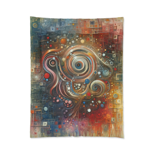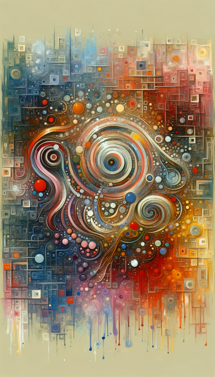 Titled Tapestry Choice Impact, this vertical image evokes a sense of the abstract in Tachism style. The composition symbolically represents the seamless tapestry of choice and impact, a concept that suggests the interconnectedness of decisions and their consequences. The artwork depicts a richly textured visual field where geometric and organic forms intertwine. At the core of the image is a dynamic swirl of lines and circles, reminiscent of the swirling patterns one might see when peering into a kaleidoscope. The lines flow with grace and rhythm, suggesting the fluidity of choices and their rippling effects. These lines and circles are embedded within a background composed of squares and rectangles that form a grid-like mosaic in a variety of hues - from cool blues and purples to warm oranges and reds. Dots and orbs of different sizes and colors are scattered throughout the piece, some clustered, others isolated, echoing the range of impacts that stem from each choice made. The bottom portion of the image allows some of these colors to descend in drips and dribbles, further emphasizing the gravity of consequences as they metaphorically drip into the fabric of reality. The visual contrast between structured geometry and the fluid organic shapes creates a striking visual metaphor for the complexity of decisions and their outcomes, framing the human experience as an intricate and colorful mosaic influenced by the choices we make.