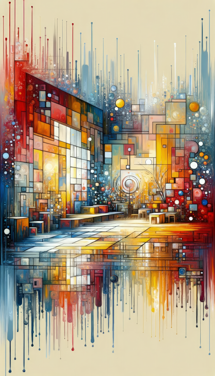The image titled Reflective Habitation Art is a stunning example of Tachism, an abstract painting style characterized by the spontaneous dribbling, splashing, or smearing of paint on the canvas. This particular artwork stands as a vertical testament to the concept of The Art of Reflective Habitation, where the play of colors and forms come together to depict a space that is at once familiar and fantastical. At the forefront, the painting showcases geometric color blocks with sharp lines and varying opacities, creating an impression of architectural structures. Warm hues of red, orange, and yellow are juxtaposed against cooler blues, which adds a visually pleasing contrast to the piece. Amid these shapes, spherical forms and occasional swirl patterns add an organic feel to the sharp geometry of the spaces, suggesting a harmonious balance between rigid human construction and the fluidity of natural design. The lower half of the painting is a mirror reflection of the vividly painted structures above, but with a twist that aligns with the Tachism style— the reflection is portrayed through long, vertical drips of colors that flow downwards. This blending of upward, crisp architectural forms with the downward streams of their reflections creates a sense of duality, inviting contemplation on the boundary between reality and reflection. Interestingly, the center of the composition features a spiral pattern that resembles a focal point or perhaps a portal, inviting viewers to consider the depths of introspection and the inner spaces one inhabits. This visual metaphor of reflection