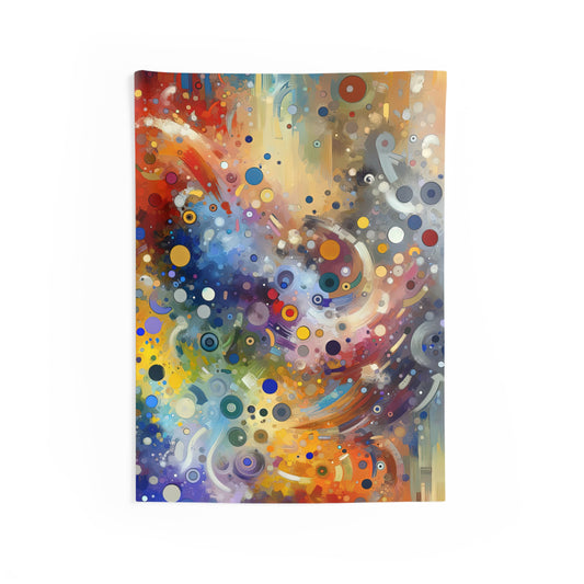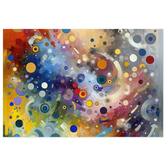 The artwork titled Humorous Unified Tachism is a vertical Tachism style painting pulsating with a vibrant spectrum of colors and a playful arrangement of shapes. It is symbolizing Humor as the Great Equalizer, and indeed, the array of hues and forms come together in a dynamic harmony that captures the essence of humor s unifying force. At the heart of the painting, amidst bold streaks of red, orange, yellow, and blue, a whirl of circular forms draws the eye. These shapes in various sizes, from tiny dots to large orbs, are sprinkled with whimsy, creating an effervescent effect. Hints of white and black dots add contrast and depth, suggesting a laughter-filled narrative happening just beneath the surface. Abstract patterns of color and lines flow up and down the canvas, representing laughter rippling through an audience, connecting people of all backgrounds. It is a visual symphony of joy where colors splash against the canvas as if bouncing to the rhythm of a shared joke, reminding viewers that humor knows no bounds. The complexity and movement of this artwork embody the spontaneous and unpredictable nature of humor, while also asserting its power to bridge gaps and bring together individuals from all walks of life. It celebrates humor s ability to dissolve barriers and create an atmosphere of inclusivity and joy.