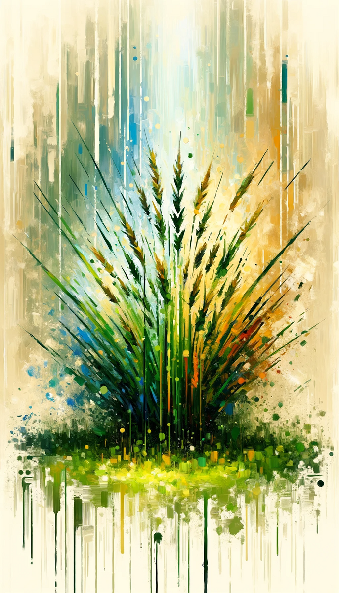 The image titled Grass Testament Change is a vivid and striking Tachism style painting that symbolically represents the deep philosophical concept of change. It is a vertical composition dominated by a dynamic cluster of grass blades at its center, reaching upward and bursting with a spectrum of colors. Warm golden hues meld with cool blues and greens, invoking a sense of life and growth at the core of the image. Surrounding the colorful grass are heavy, abstract brushstrokes that cascade downwards like rain or tears in cathartic release. These streaks of paint vary in opacity, suggesting movement and a sense of passing time. The background interplays light and shadow, featuring a palette that complements the central imagery with softer shades that give the appearance of diffused light, akin to a sunrise or sunset. The droplets, or splatters, of paint featured in the lower part of the image provide an organic feel, evoking the natural imperfections and randomness inherent in both nature and human perception. Together, this combination of color, form, and texture creates a harmonious balance, stirring an emotional response that aligns with the theme of transformation and the impermanent nature of reality, as signified by each blade of grass underfoot.