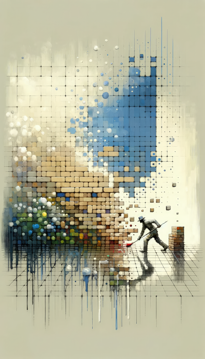 Titled Change Tachism Everyday, the vertical artwork is a symbolic representation of societal change conceived through the lens of Tachism, an abstract painting style akin to Abstract Expressionism. It employs a distinctive array of seemingly random splotches, drips, and splatters to convey its theme. The canvas is an amalgamation of varied color blocks and streaks, predominantly in hues of beige, white, blue, and touches of other colors, creating a mosaic that subtly alludes to complexity and diversity within society. Amid the serene chaos of colors and form, the piece is punctuated by a solitary figure positioned at the bottom right. This figure, depicted in silhouette and wielding a paint roller, appears to be actively contributing to the evolving tapestry of change, signifying the power of individual actions in shaping the collective. The figure stands out against the backdrop, in stark monochrome, seeming to have emerged from the shadows to take an active role in the transformation process. This clever visual metaphor manifests the underlying message that societal change often begins with small, everyday gestures from individuals—a concept both simple and profound. Moreover, the artwork uses dripping and bleeding effects, some colors bleeding vertically down the canvas, suggesting that change is not only a build-up of actions but also a process of seeping influence that eventually saturates and alters the fabric of society. The technique and subject matter merge to create a thought-provoking piece that invites reflection on personal impact and communal evolution.