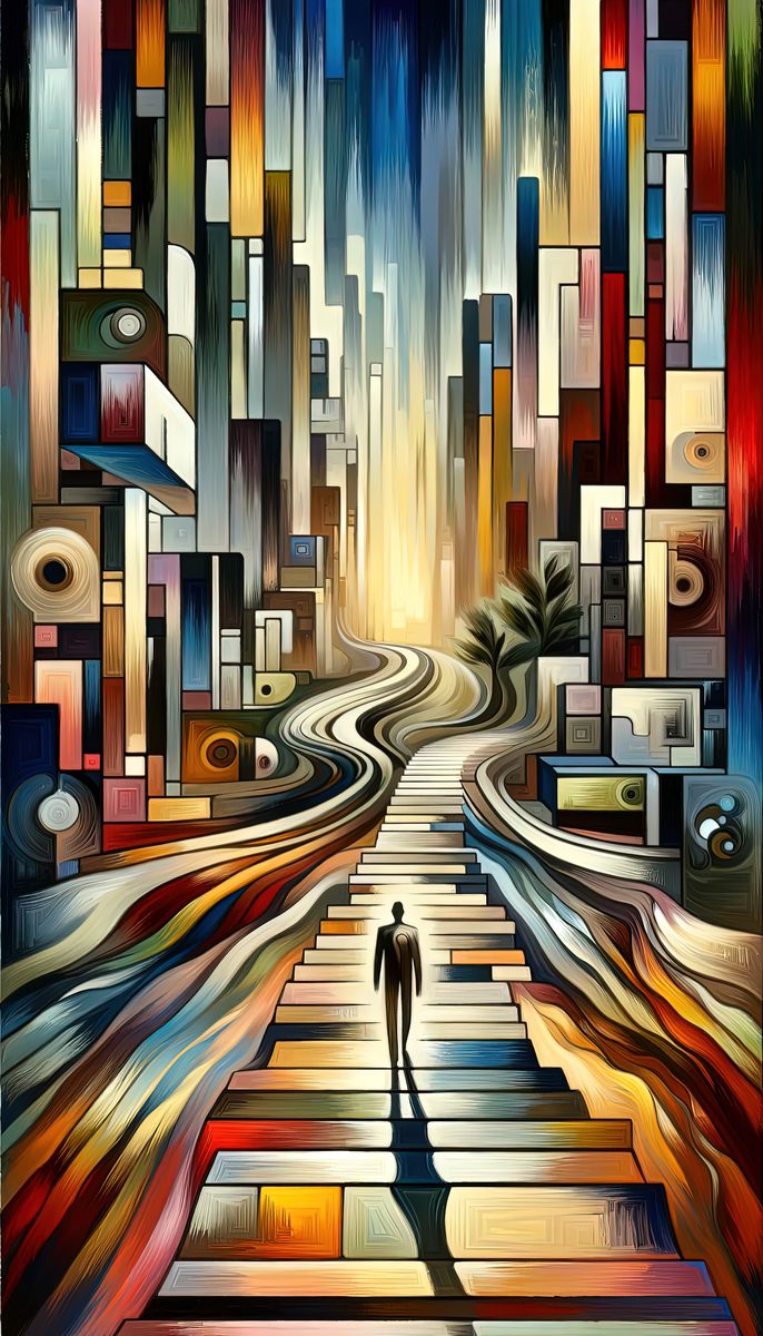 Titled Relatable Journey Abstraction, this vertical Tachism-style painting captures the essence of an individual s personal voyage. In the foreground, a solitary figure stands poised at the beginning of a stairway, suggesting the commencement of a journey. The stairs, rendered in stark white against the vibrant, multi-hued landscape, create a strong focal point that draws the viewer s eye toward the traveler. Surrounding the central figure, the painting bursts with a rich tapestry of colors and geometric forms that resemble an abstract cityscape. Vertical and horizontal lines intersect and overlap, creating a complex pattern that echoes the cacophony and rhythm of urban life. Bright highlights and deep shadows juxtapose to suggest depth and the intangible nature of the city that could signify the multiple paths and options available in one s life journey. To either side of the stairs, there s an assortment of shapes that resemble speakers, suggesting the possibility of music or the importance of listening and communication on this metaphorical journey. Moreover, the smooth, wave-like patterns in the areas adjacent to the pathway give the impression of a dynamic, fluid landscape in motion, embodying the inevitable changes and unpredictability of life s path. In the distance, a soft glow emanates from an undefined source, imbuing the scene with a sense of hope and destination. This light may symbolize the future or a goal to strive towards, guiding the traveler onward. Overall, the artwork uniquely combines the structural elements of a tachist style