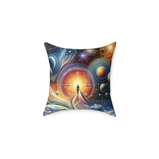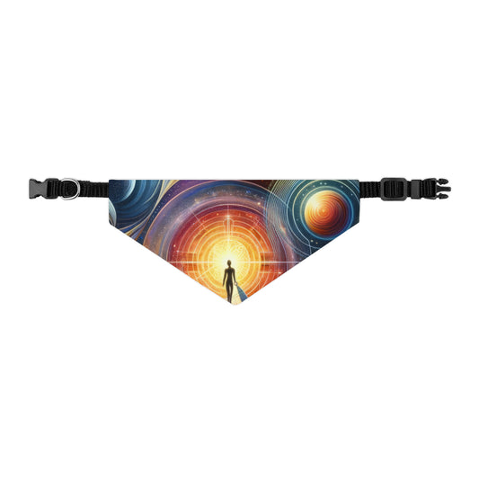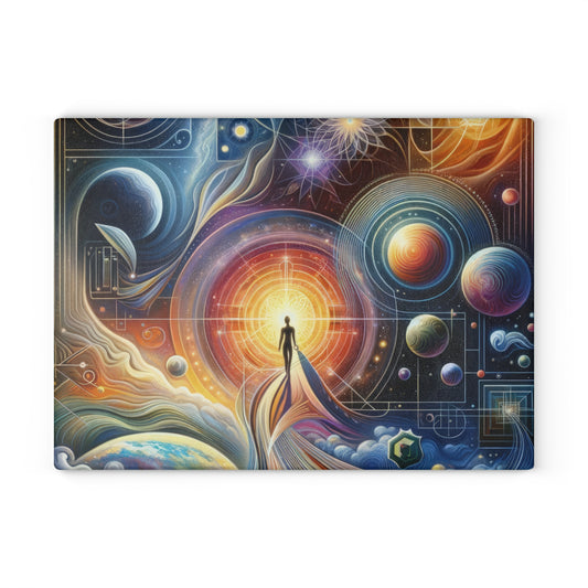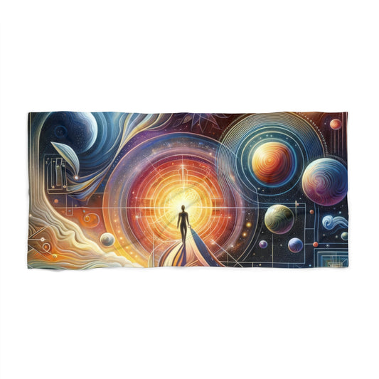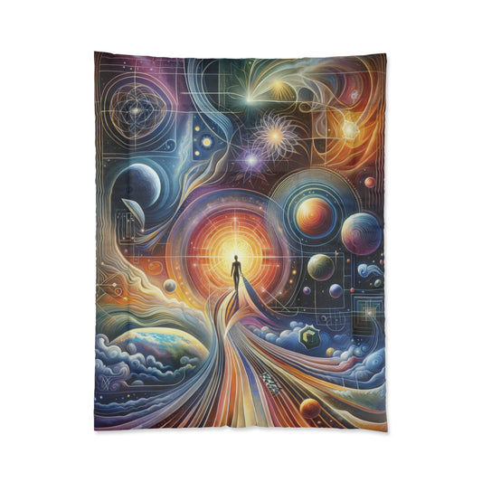 The image titled Unified Cosmic Alignment is a vibrant artistic masterpiece encapsulating the theme of cosmic and spiritual awakening. At the center stands a solitary human silhouette on a path that extends from the foreground into the heart of a radiant, circular light that symbolizes enlightenment. Radiating outwards from this central point are multicolored beams that evoke the energy of chakras or the spectrum of light dispersing into its component colors. The intricate backdrop is woven with swirling galaxies, mystical nebulae, and an array of planets that suggest a harmonious celestial dance. The heavens are adorned with intricate geometric shapes and lines that imply a hidden order and sacred geometry within the cosmos. The deep blues, purples, and reds of the space create a contrast with the warmth emanating from the figure s enlightenment center. Cosmic elements such as stars and orbits intersect with the translucent white outlines suggestive of mathematical or architectural plans, hinting at the connectivity of the universe s physical laws with the spiritual journey. Above, ethereal waves intertwine with the stardust, capturing the fluid interplay between matter and energy. This artwork conveys a profound sense of unity between the individual s spiritual quest and the grand cosmological scale, encapsulating personal and planetary alignment within the vast tapestry of existence. It s a visual symphony that encourages viewers to consider their own place within the universal whole.