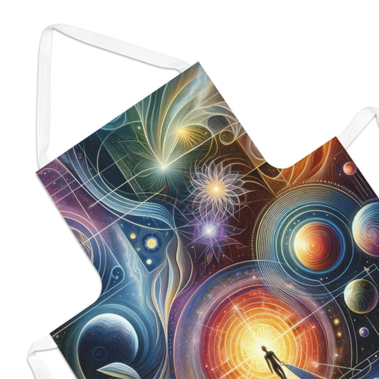 The image titled Unified Cosmic Alignment is a vibrant artistic masterpiece encapsulating the theme of cosmic and spiritual awakening. At the center stands a solitary human silhouette on a path that extends from the foreground into the heart of a radiant, circular light that symbolizes enlightenment. Radiating outwards from this central point are multicolored beams that evoke the energy of chakras or the spectrum of light dispersing into its component colors. The intricate backdrop is woven with swirling galaxies, mystical nebulae, and an array of planets that suggest a harmonious celestial dance. The heavens are adorned with intricate geometric shapes and lines that imply a hidden order and sacred geometry within the cosmos. The deep blues, purples, and reds of the space create a contrast with the warmth emanating from the figure s enlightenment center. Cosmic elements such as stars and orbits intersect with the translucent white outlines suggestive of mathematical or architectural plans, hinting at the connectivity of the universe s physical laws with the spiritual journey. Above, ethereal waves intertwine with the stardust, capturing the fluid interplay between matter and energy. This artwork conveys a profound sense of unity between the individual s spiritual quest and the grand cosmological scale, encapsulating personal and planetary alignment within the vast tapestry of existence. It s a visual symphony that encourages viewers to consider their own place within the universal whole.