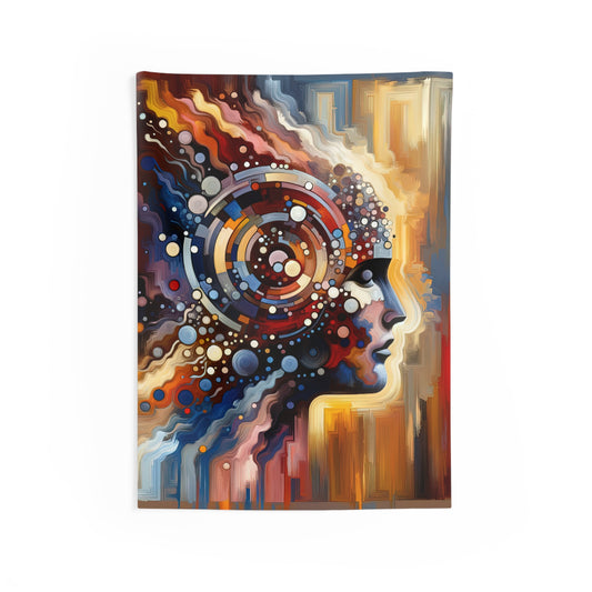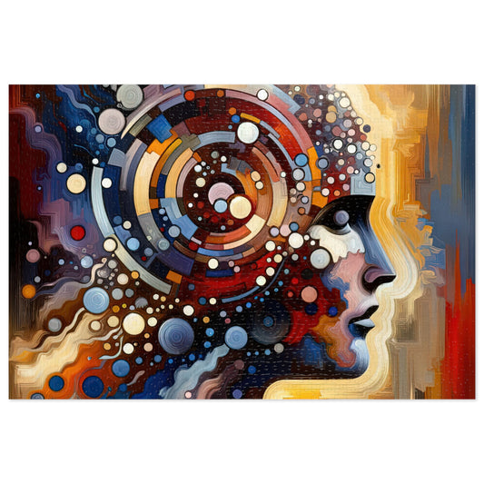 The image titled Conscious Choices Harmony is a vertical artwork executed in Tachism style, encapsulating the theme of how individual conscious decisions can culminate in collective harmony. At the center of this vibrant composition is a stylized human profile facing to the right, etched delicately against the riot of colors and shapes that seem to flow from it, suggesting an emanation of thoughts and actions. Surrounding the profile, a series of concentric circles and radiating dots create a sense of motion, reminiscent of ripples in water or the energy waves that symbolize impact and influence. This pattern may represent the idea that each choice acts as a catalyst with a ripple effect, reaching beyond the immediate scope to touch the broader community. The background is a dynamic blend of warm and cool tones, with fiery streaks of reds and oranges that transition into calming blues, encapsulating the balance and harmony resultant from conscious decision-making. Drips and splashes of paint extend downward, creating a fluid, almost musical quality to the piece, further reinforcing the connection between individual actions and the grander symphony of collective existence. Each element within this image comes together to portray a hopeful message: that within the abstract, seemingly chaotic strokes of our lives, lies the potential for creating a harmonious and resonant collective experience through intentional, conscious choices.