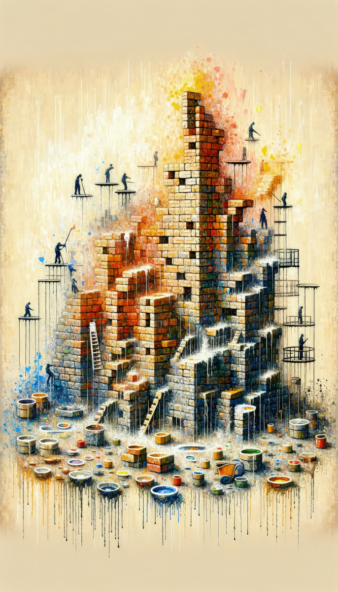 Titled Actions Constructing Society, this vertical image in Tachism style is a vibrant and symbolically charged depiction of the collective human effort that forms the foundations and structures of our society. The artwork is dominated by a central, partially built brick wall, with its varying hues of red, orange, and brown symbolizing growth and development. Scaffoldings adorn the wall, illustrating the ongoing work and progression. Tiny silhouetted figures are engaged in various activities such as climbing ladders, wielding tools, and communicating with each other, representing the daily actions of individuals contributing to a larger cause. These human forms are stylized and simplistic, suggesting that they are every person, the essential worker bees of civilization. At the base of the wall, a myriad of colorful paint buckets is spilled, their dripping contents bleeding down into the bottom edge of the canvas, implying that the actions and creations in life flow and spread beyond their immediate boundaries. The drips create a fluid connection between the tangible efforts of building and the abstract notions of influence and consequence that radiate from them. The background, with its soft beige tones transitioning to vibrant splashes of yellow and red, gives the impression of a world being continuously painted and shaped by the cumulative impact of daily work. The artwork is a medley of chaos and order, messy yet meticulously detailed, capturing the essence of society—a complex structure built one brick, one action at a time.
