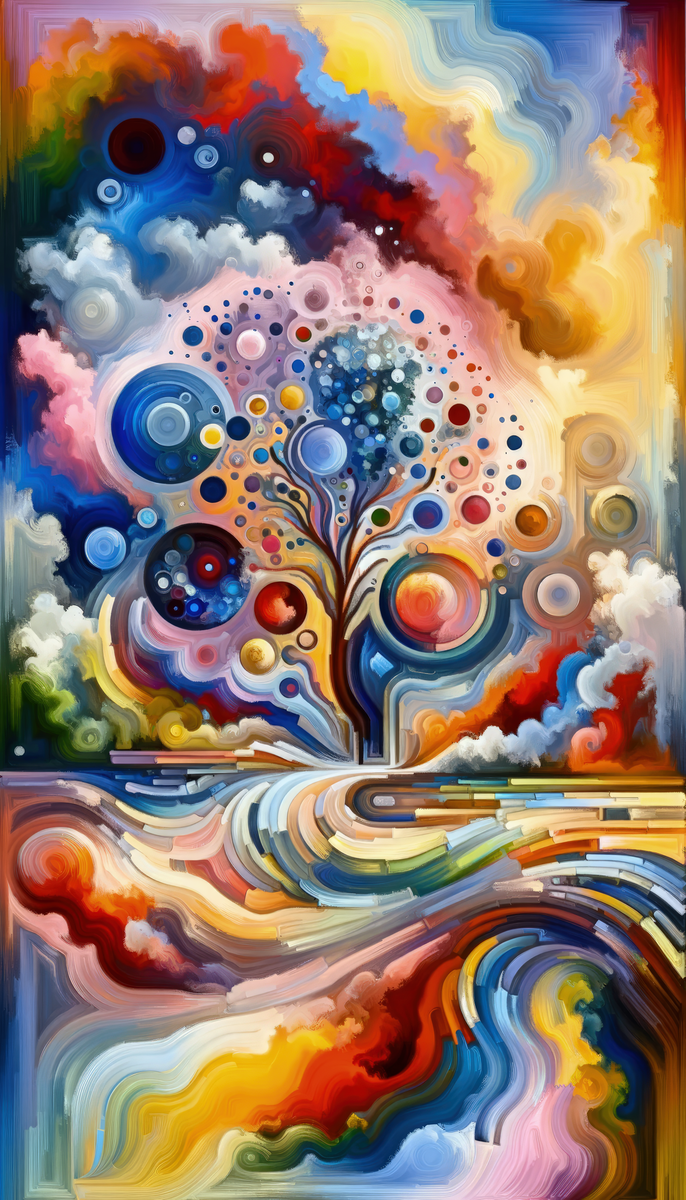 Inner Growth Essence is a vibrant Tachism style painting that vividly captures the complex theme of the ecology of inner transformation. The abstract artwork employs a swirling mosaic of colors and organic shapes that draw the viewer into a contemplation of personal growth and evolution. At its center, a tree-like form serves as a visual anchor, its branches reaching into a cosmos of colored circles and energetic bursts that suggest a sprawling canopy. Each circle, varying in size and hue, could represent a moment of insight or a transformative thought, collectively forming the intricate network of an individual s inner journey. Above the tree, the palette is dominated by a tumultuous mix of deep blues, warm reds, and vibrant orange tones, possibly illustrating the tumult and upheaval often associated with personal change. Soft clouds of white and patches of serenity amid the chaos evoke a sense of balance and peace that can be achieved through such transformation. The lower portion of the composition features undulating waves and harmonious lines that flow horizontally across the canvas. These rhythmic patterns might symbolize the steady foundation of one s core being, the stable ground upon which inner growth is nurtured. Overall, the painting is a kaleidoscope of emotional intensity and thoughtful reflection, encapsulating the essence of inner metamorphosis through its abstract and dynamic visual language.