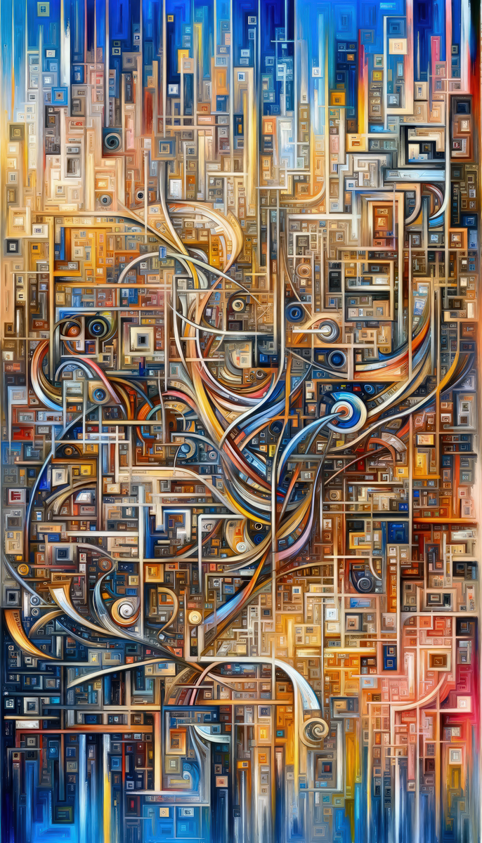 Titled Intricate Life Tapestry, this vertical Tachism style painting delves deep into the symbolism of The Fabric of Daily Life. The abstract composition distills the essence of life s complexity, encapsulating the dazzling and intertwined aspects of existence into a visual form. The canvas is dominated by a convergence of elongated, interconnected rectangles and blocks, representing the structured segments of daily life. These elongated forms stretch vertically, merging toward the painting s center, creating a sense of dynamic motion and interconnectedness. Amidst this geometric array, ribbons of organic lines flow and twist, introducing contrast with their smooth curves and spirals. These sinuous lines are painted in a softer palette, suggesting a dance of more fluid, unpredictable elements that weave through the rigid structures. The color scheme employs a rich blend of warm earth tones—browns, tans, and creams—and cool hues such as blues and grays, mirroring the diversity and vibrancy of life s experiences. Light and shadow play across the surface, adding depth and movement, giving the impression of a living entity that pulsates with the rhythms of routine and the unexpected events that cut through it. The painting is a metaphorical visual journey, encouraging the viewer to ponder the woven patterns of their own life, the routine, and the sudden twists that define our shared human experience.