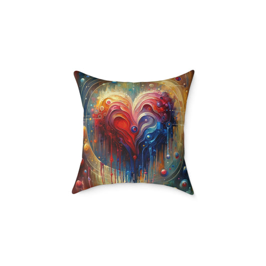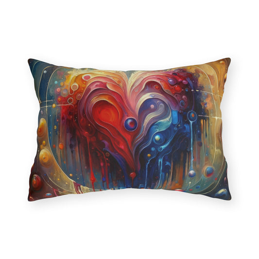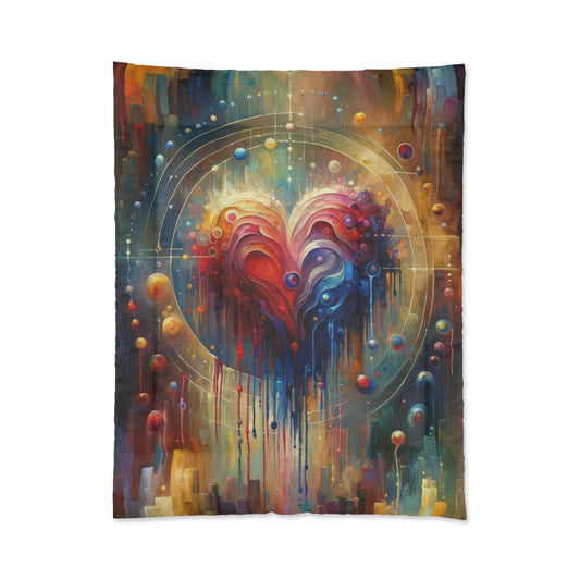 Titled Unified Heart Reflections, this striking visual composition exemplifies the Tachism style of abstract painting. The central motif is a radiant heart, rendered in cerulean blue and deep crimson hues that merge together, symbolizing the intimate dance of unity and duality. The heart appears to be floating amidst a cosmic backdrop, with luminescent globes and orbs that could represent celestial bodies, thoughts, or emotions swirling around it. Vibrant, dripping streaks emanate from the heart, suggesting a sense of movement and emotional overflow. These streaks bleed into the lower half of the canvas, merging with the faint outlines of abstract, geometric shapes reminiscent of a cityscape or a complex otherworldly structure. Curved lines, possibly indicating orbits or waves of energy, intersect the composition, lending it a sense of rhythm and flow. There is a rich interplay of light and dark, with the upper part of the image bathed in lighter, warmer colors, while the bottom half is adorned with cooler, more subdued tones. This gradient invites contemplation on the spectrum of experiences and emotions contained within the unified journey of the heart. The overall effect of the artwork is one of profound introspection and connectedness, as though capturing a moment of universal harmony and personal revelation within the boundless canvas of the soul s odyssey.