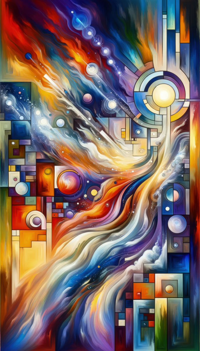Titled Cosmic Tachism Alchemy, this vibrant vertical painting is a melange of swirling colors and geometric shapes that coalesce into a visual interpretation of everyday magical transformation. Energetic strokes of crimson, sapphire, and gold collide with serene pools of cobalt and midnight blue, suggesting a cosmic dance between chaos and order. The tachism style is evident in the free and spontaneous application of paint, creating a dynamic and textured surface. At several points in the composition, spherical forms resembling celestial bodies connect through sweeping gestures, reminiscent of shooting stars or the trail of a comet streaking across a night sky. These orbs of light appear to emerge from a stunning central motif, a radiant sun or perhaps a representation of an alchemist s crucible, where elements transmute into gold. The bold, straight-lined forms anchor the tumultuous energy, symbolizing the structures and constructs of daily life. Their varying sizes and colors imbue the scene with a rhythm, like the ticking of a cosmic clock or the passing of seasons. Some squares and rectangles encase smaller circles, hinting at atoms or molecules, the basic units of matter undergoing constant change. Collectively, the painting encapsulates the essence of transformation, suggesting that within the routine and the mundane lies the potential for extraordinary metamorphosis. Cosmic Tachism Alchemy invites the viewer to contemplate the perpetual flux of the universe and our place within it, turning the ordinary into something truly mesmerizing.
