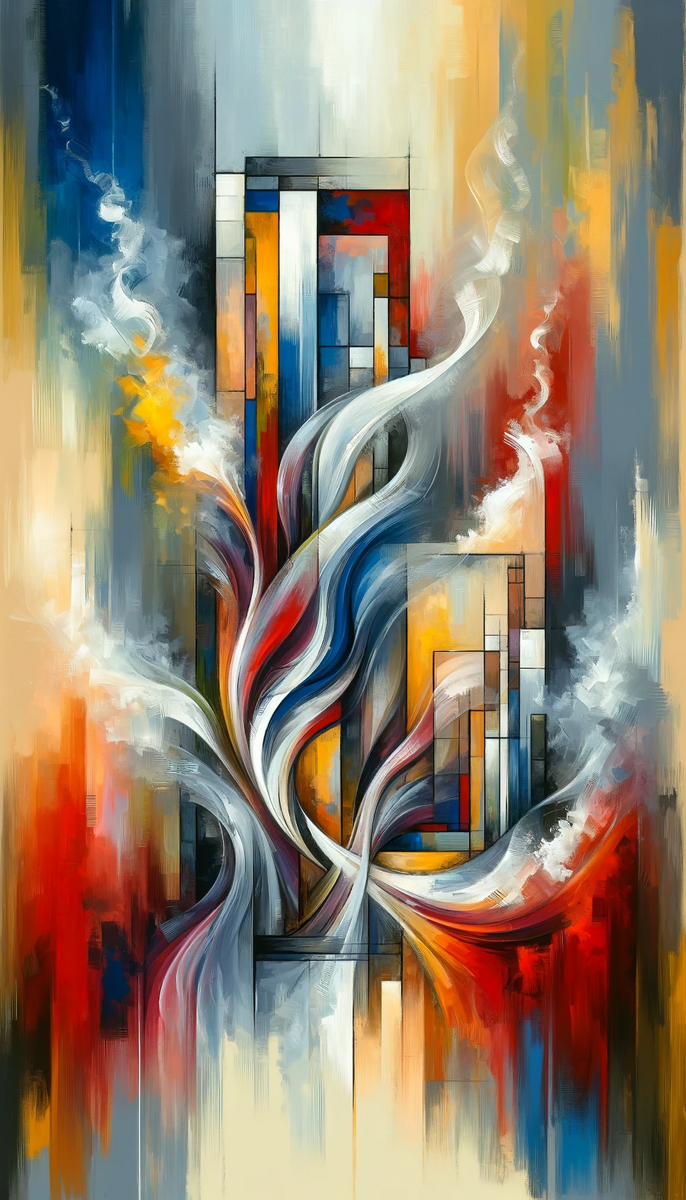 Titled Transcending Abstract Limitations, this vertical Tachism style painting embodies the stirring sentiment of An Ode to Limitations, wrapped within an abstract expressionist aesthetic. Through a vivid and dynamic interplay of form and color, the work portrays the concept of embracing and transcending limitations. At the painting s heart, a striking formation resembles intertwined ribbons or streams of liquified color flowing upward, suggesting movement and growth beyond unseen barriers. Radiant whites and silvers seem to dance with bold reds and blues, creating a sense of energy and vitality. These central forms twist and turn with fluidity, bounded yet breaking free from their surroundings. Framing these sinuous shapes are structured, geometric blocks and rectangles stacked upon one another, tinted with earth tones and primary colors. The contrasting starkness of geometry against the organic swirls highlights the confinement of form, emphasizing the theme of transcendence as the swirls appear to wisp beyond the solid constructs. The background is a myriad of brushstrokes in cool and warm hues, setting a stage that fluctuates between calm and chaos, reflecting the complexities of limitations and the journey to overcome them. The top and bottom of the composition blur into near-monochromatic fields, light at the base ascending into darkness, possibly symbolizing the emergence from constraint towards boundless possibility.