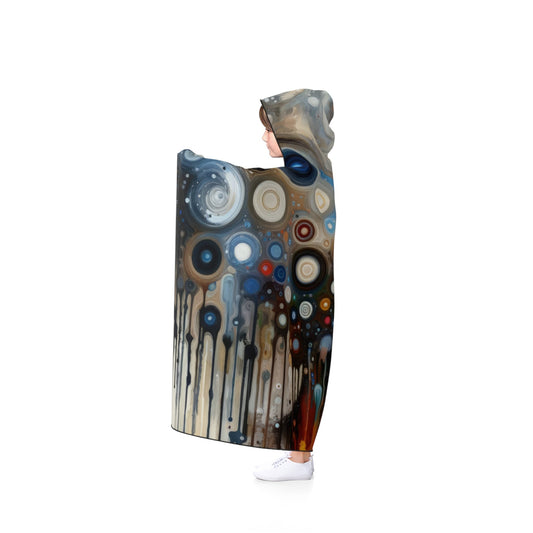 Titled Universal Personal Tachism, the vertical image is a vivid embodiment of the Tachism art style. It captures the deep and complex idea that the personal is, indeed, universal. The painting is a melange of emotional intensity and abstraction, symbolizing the interconnected nature of individual experience and collective existence. Prominent in the artwork is the silhouette of a human profile towards the bottom right, subtly integrated into the overall design. This profile is composed of various warm colors, suggesting the presence of individuality amidst the vast tapestry of experiences. The myriad of concentric circles and organic shapes that sprawl across the canvas resemble celestial bodies or the intricate workings of an inner mindspace, implying a cosmos of thoughts, emotions, and soulful expressions. Drips and streaks of paint cascade down the composition, as if the thoughts and feelings are pouring out, uninhibited, from the subconscious to the conscious, from the individual to the cosmos. The color palette transitions from dark, mysterious blues and blacks at the top to earthy tones and finally to bold reds and whites, mirroring the spectrum of human emotions and the essence of our shared humanity. Engaging the observer in a visual journey that is both introspective and expansive, the image embodies the fluidity of personal experiences that resonate on a universal level. It wonderfully encapsulates the chaos and order, the individual and the collective, the microcosm and the macrocosm, all interwoven into the fabric of life.