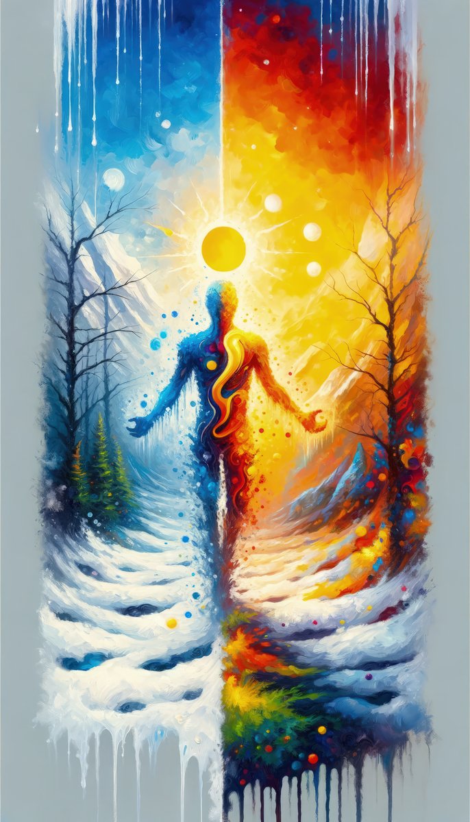 The image titled Invincible Summer Discovery is a vertical display of Tachism, a style of abstract painting characterized by splotches and dribbles of paint. The artwork powerfully evokes the theme of an inner, unbeatable summer found amidst the coldest winters. At the center stands a human figure, painted as a radiant beacon, seamlessly merging with the background. The figure s body is ablaze with warm colors—reds, oranges, and yellows, depicting an ember-like core—while its surroundings are a stark contrast of icy blues and whites, symbolizing winter. This human form seems to divide two distinct worlds. To the left, a frigid landscape begins to thaw, evidenced by icicles melting down from the treetops, while the right side bursts with autumnal fire, leaves, and branches in a state of transformation. The colors smoothly transition from a chilly blue at the top to a vibrant orange at the bottom, suggesting a shift from winter to summer that the figure might be experiencing internally. Further complementing the idea of internal warmth and external cold, the sun appears as a bright orb above the figure s head, casting light that seems to fuel the transformation happening within the individual. Splashes and bursts of color around this luminous body reinforce a sense of magic or spirituality associated with this inner discovery.