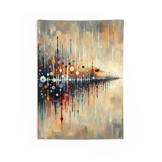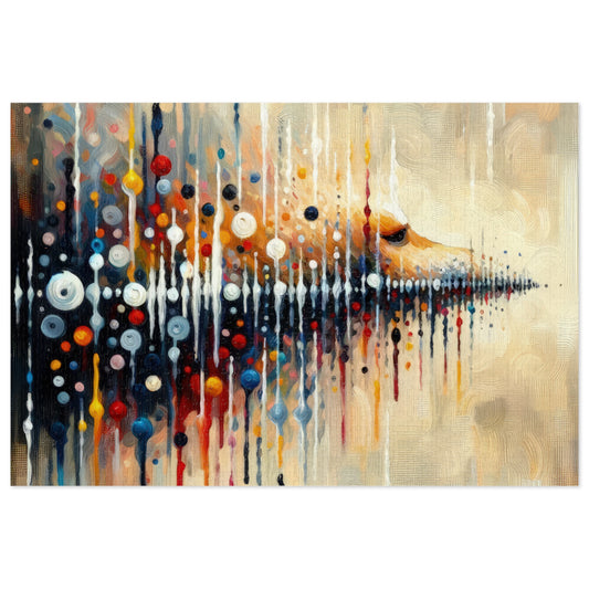 The image titled Distant Barking Echoes is a vertical artwork created in a Tachism style, which is characterized by the application of paint in a spontaneous and instinctive manner. The painting symbolically represents the sound of a neighbor s dog barking at a distance. The canvas is a vibrant mix of colors and patterns that allude to the dispersal of sound waves as they travel through space. The composition is dominated by an array of dark and bright drips, dots, and splashes that create a dynamic and somewhat chaotic texture. Central to the artwork is a concentration of circular forms in various sizes and colors, against a background of neutral hues. These forms are suggestive of sound waves rippling outwards, their positioning and color intensity perhaps capturing the sense of sound as it fades and intensifies. The lower part of the composition becomes denser with color, potentially representing the onset of the sound, which then diffuses and diminishes as the eye travels upwards across the painting. The patterned backdrop suggests the ambient environment that absorbs and muffles the sound of the distant barking. Overall, the interplay of form, color, and texture provides a visual metaphor for auditory experience, reflecting both the persistence and ephemerality of sound.