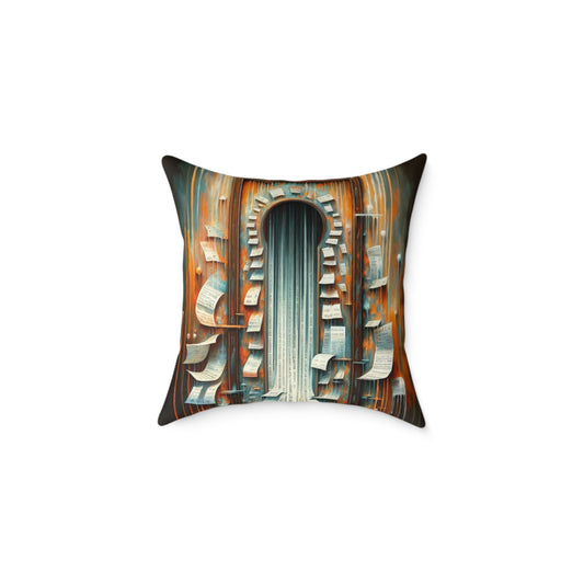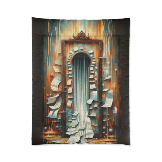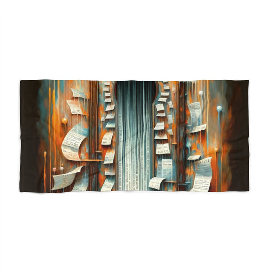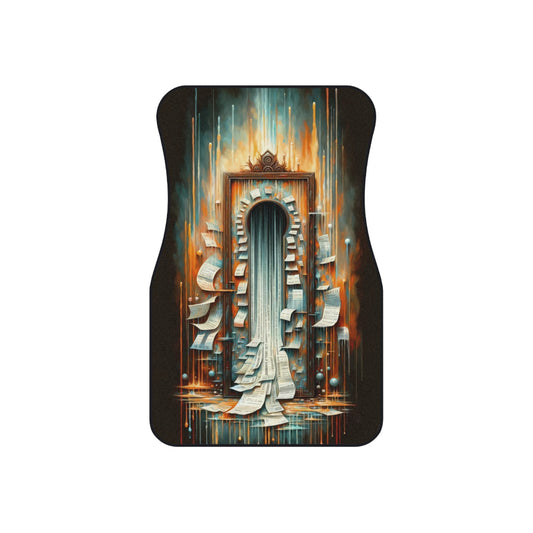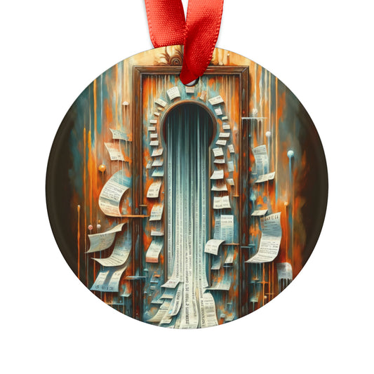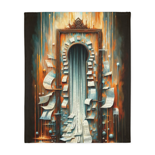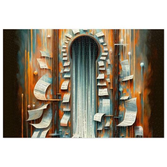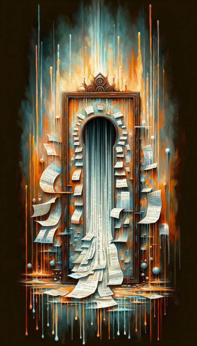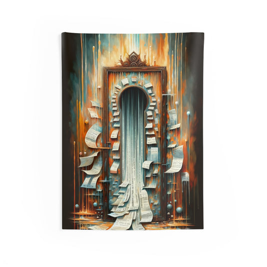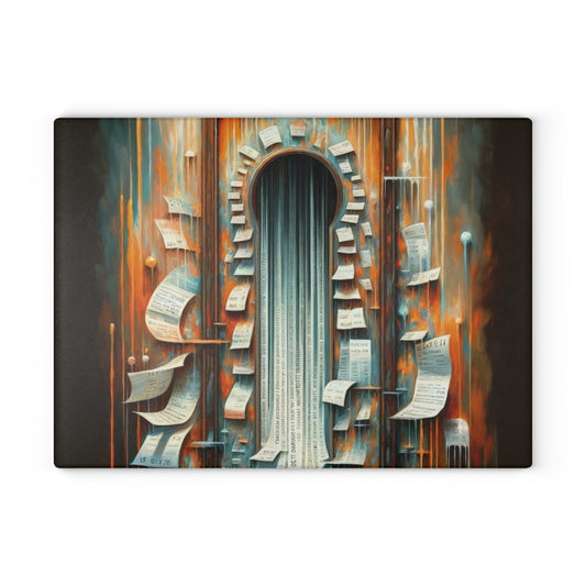 The image titled Illuminated Truths Mirror is a captivating representation in the Tachism style, symbolizing the concept of an internal mirror. This artwork is not centered on vanity but rather aims to illuminate hidden truths. The focal point is a vertical, ornate mirror with a long, reflective surface cascading down like a waterfall. Its form is reminiscent of an elongated keyhole, suggesting an unlocking or revelation of deeper insights. Around the mirror, numerous paper sheets float, some gently curving, while others have sharp, angular bends. Each paper bears text, reminiscent of pages torn from books or snippets of personal notes, signifying the scattering of knowledge or fragmented thoughts. Behind this display is a tumultuous backdrop ablaze with a palette of fiery oranges, reds, and smoldering blues. Streaks of bright, dripping lights traverse the canvas vertically, evoking the feeling of something both melting away and being cast with illumination at the same time. The climax of this visual narrative is where the mirror meets the base, where the reflective surface transforms into a cascade of printed words on strips of paper, flowing outward from the base like a torrent of released secrets. The entire scene exudes a dynamic tension between the fiery, chaotic background and the cool, introspective calmness of the mirror s surface, weaving a tale of internal exploration and the quest for understanding one s own truth amidst external cacophony.