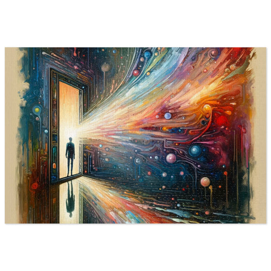 The artwork titled Mirror Wholeness Tachism is a striking vertical image that exemplifies the Tachism style, which is characterized by spontaneous brush strokes, drips, and the use of color to express emotion. This piece symbolically represents the concept of Peering Into the Mirror of Wholeness. Within the painting, a fascinating amalgamation of bold colors and abstract forms creates a sense of depth and movement. Explosive swirls of red, blue, yellow, and an array of other hues blend together, reminiscent of the chaos and beauty found in the cosmos. The bright droplets and elongated streaks that seem to drip downwards evoke a sense of fluidity, as if the colors were freshly applied and still in motion. At the center of the image, a luminous door-like mirror stands as the point of convergence for the dynamic whirls and eddies that surround it. It appears to radiate light, inviting a solitary silhouette of a person that is observed standing before it, suggesting a moment of introspection or discovery. The figure’s reflection on the sleek floor beneath reinforces the theme of wholeness, as both the literal and metaphorical reflections merge in this vibrant composition. Overall, the painting encapsulates a moment that transcends the conventional, guiding viewers into a metaphorical journey through the mirror into a realm of self-reflection and universal connection. The integration of color, form, and symbolism crafts an evocative narrative that encourages contemplation on the
