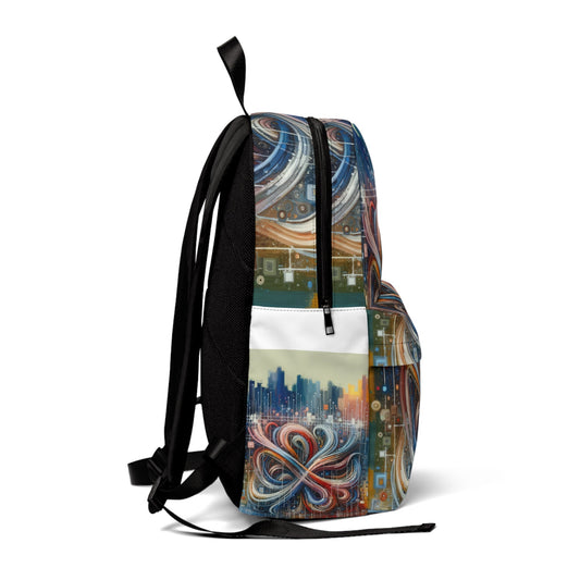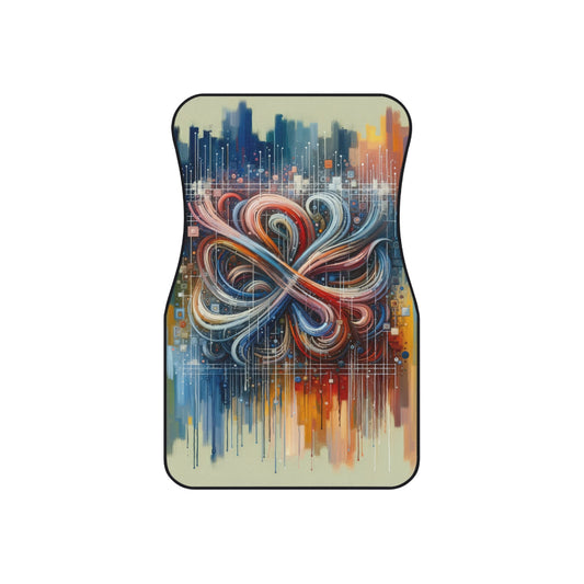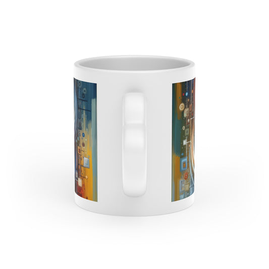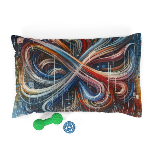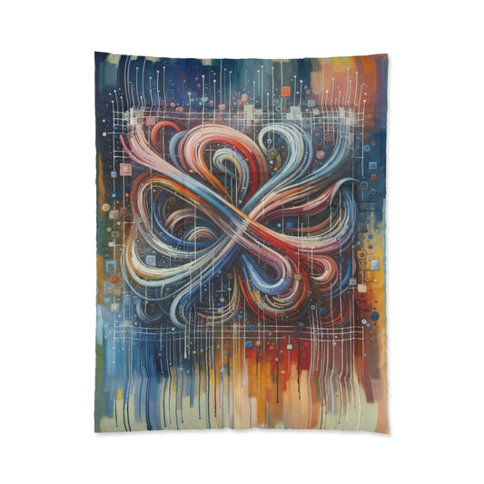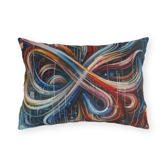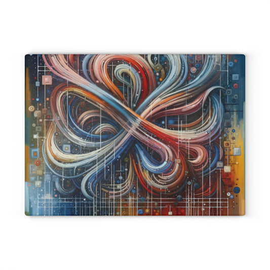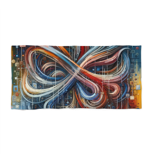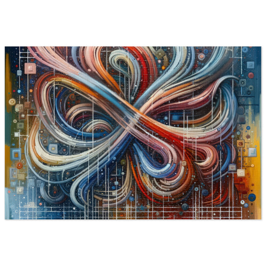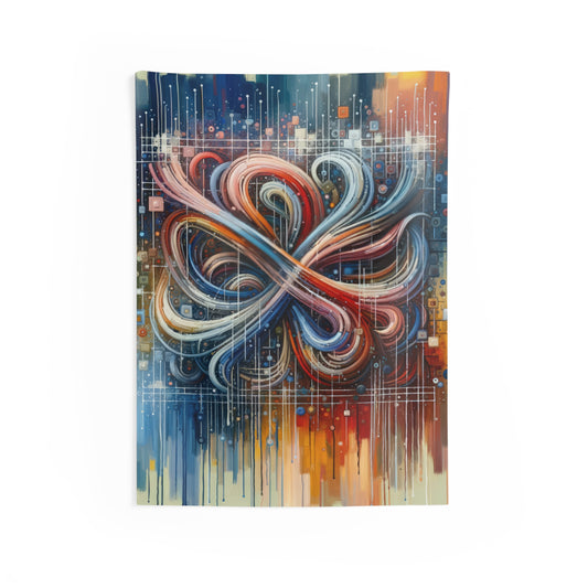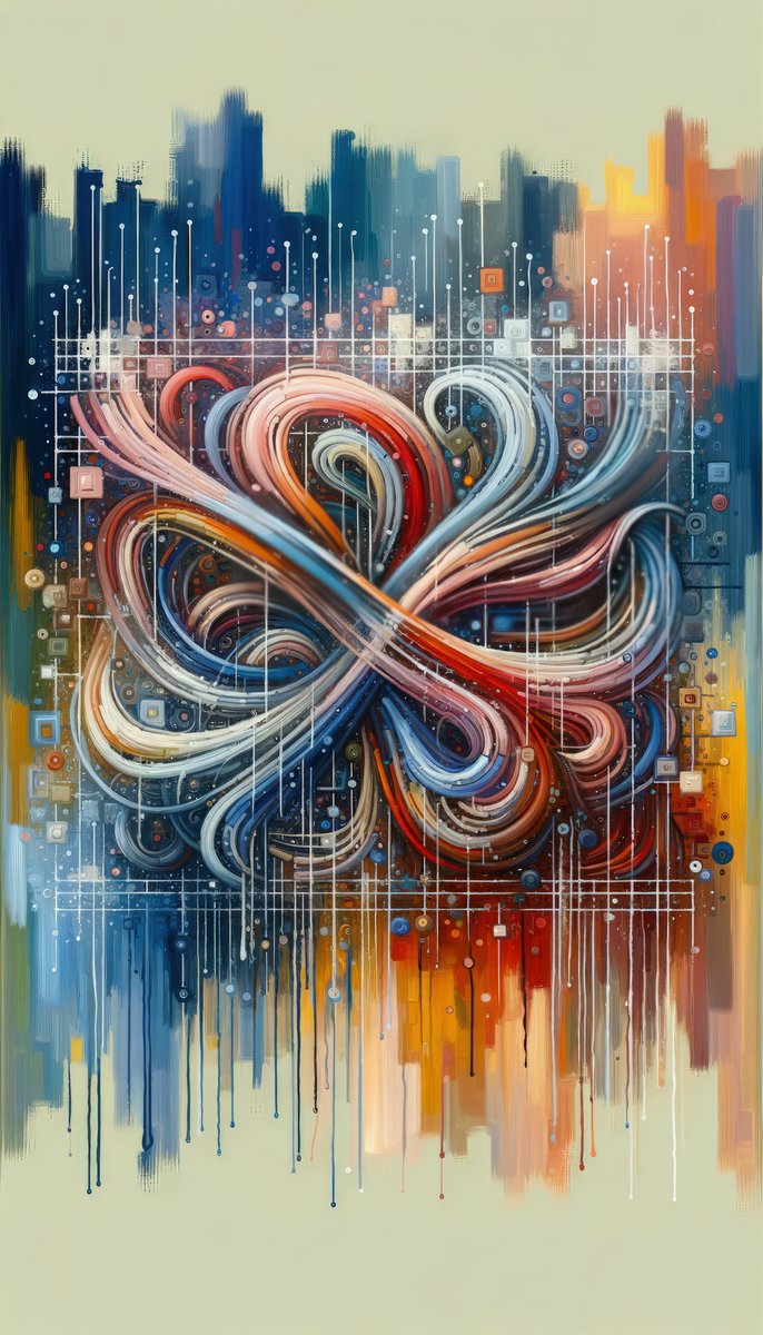 The image titled Humanity Tapestry Unification is a vibrant, vertical Tachism style painting that symbolically represents the concept of weaving the threads of humanity into a tapestry of unified well-being. The foreground features a multitude of intertwining threads, organically crossing and looping around one another in a harmonious blend of earthy reds, warm oranges, tranquil blues, and soothing creams, suggesting intertwining human lives and experiences. The threads are thick with texture and create a sense of movement and depth, flowing into one another as if they are part of an ever-evolving story. The background suggests a cityscape horizon at the top that gradually gets more abstract and dissipates towards the bottom of the canvas. It possesses a unique blend of sharp vertical lines and softer, pixel-like squares and circles that mimic the fall of rain or the extension of the threads into the surrounding space, reinforcing the theme of unity and interconnectivity. The colors in this section transition from calming blues and greens on the sides, suggesting stability and growth, to more dynamic and warmer hues towards the center, reflecting human passion and energy. Droplets seem to trickle from the woven patterns, creating a sense of growth, decline, and regeneration, suggesting that this tapestry is constantly being woven through human interactions, shaping a dynamic and interconnected community. The painting is a visual metaphor for the complexities and connections of human unity across cultures and experiences.