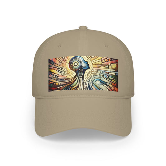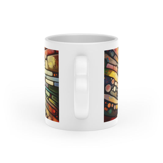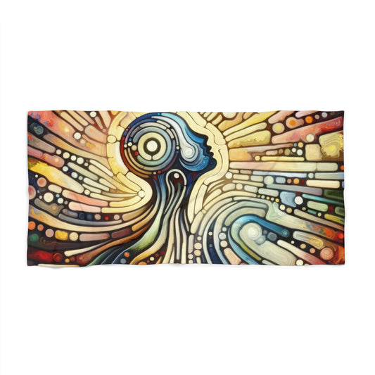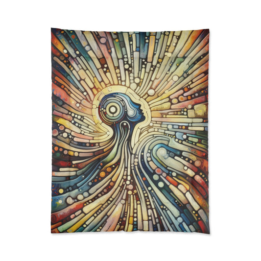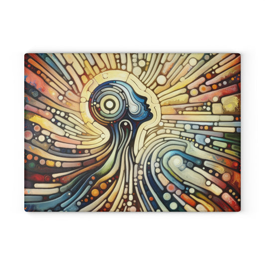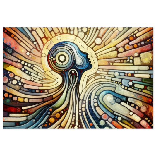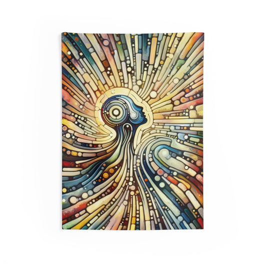 Inner Mosaic Kindness is a vertical image realized in a Tachism style that symbolically represents the concept of Crafting the Inner Mosaic of Kindness . The artwork exhibits a vivid exploration of color and form, invoking a sense of organic unity and diversity. At the heart of the piece is a swirling focal point, reminiscent of an intricate eye or celestial body, from which the mosaic emanates. This central motif could symbolize the core of kindness within, serving as the origin of all outward expression. Radiating lines and circles of varying lengths and sizes flow outwards, forming a burst of dynamic streaks, which could interpret the spreading of kindness through every facet of life. The colors are a rich tapestry of warm and cool tones, blending seamlessly into each other, from deep cerulean blues to fiery oranges and reds, punctuated with soothing creams and earthy browns. Elevated by the glossy finish, the colors have a luminous quality, as if each brushstroke carries its own light. Many of the lines are bordered by thin rings of contrasting colors, adding depth and the illusion of three-dimensionality to this abstract composition. The interspersed dots and circles throughout the mosaic add a playful texture, while also potentially representing moments, people, or experiences that contribute to the overall theme of kindness. The piece captures the complexity and beauty of crafting kindness within oneself and does so with a hypnotic, rhythmic harmony that invites the viewer to reflect on the