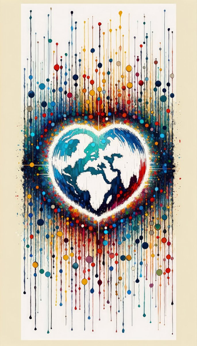 Titled Heartbeats Synchronizing Peace, this vertical image embodies the Tachism style of abstract painting and vividly symbolizes the notion of over seven billion heartbeats in harmony, striving collectively for peace. The central motif is a heart-shaped representation of the Earth, portrayed in soothing blue and white tones that indicate the oceans and continents, suggesting a global unity of purpose. The heart is surrounded by a halo of radiant, swirling colors—reds, blues, oranges, and yellows—as if to represent the diversity and energy of life across the planet. An array of elongated drips and splatters stemming from the heart map extends toward the edges of the canvas, some reaching the very top, while others vary in length. These drippings embody an assortment of colors, signifying the myriad cultures and individuals that comprise our world. The pattern created by these drips and dots resembles the rhythm of countless heartbeats, visually interpreting the pulse of humanity. The confluence of colors and textures within this piece evokes a sense of dynamism and passion. It is a visual metaphor for the interconnectedness of people around the globe, with the cohesive movements of colors and shapes symbolizing collective aspirations for a peaceful and harmonious world. The image, with its abstract expressionism, is impactful and thought-provoking, offering a poignant reminder of our shared humanity and the universal desire for peace.