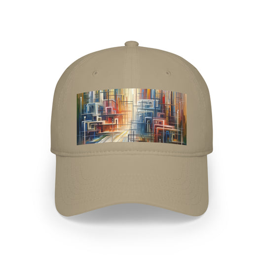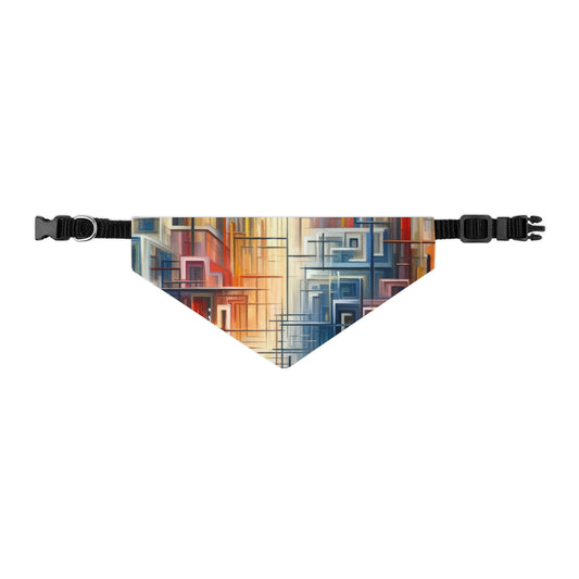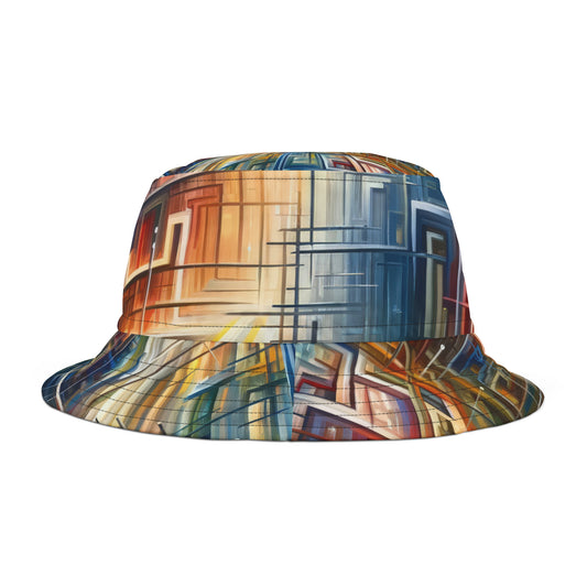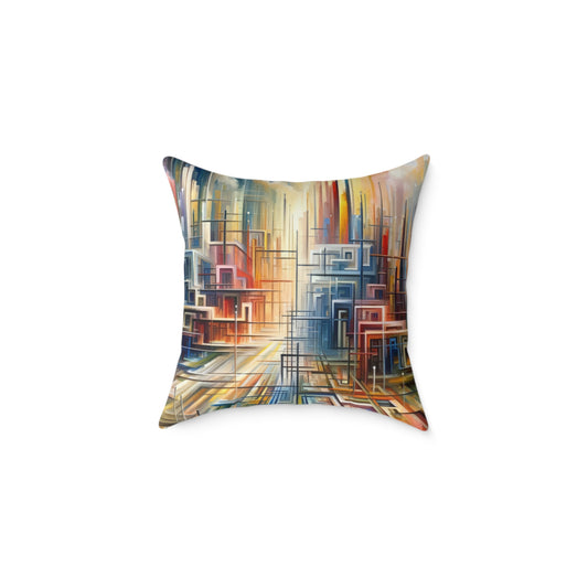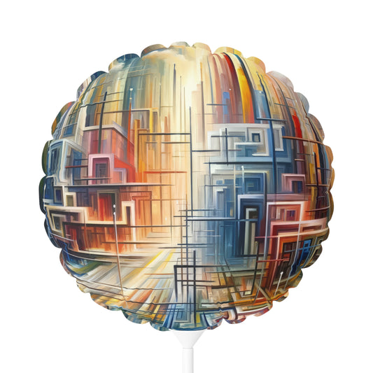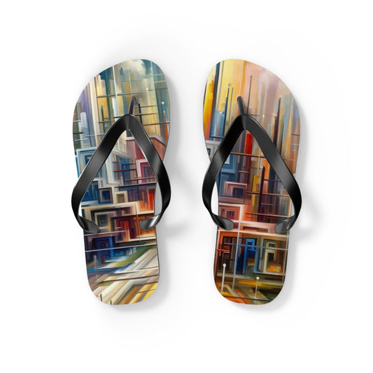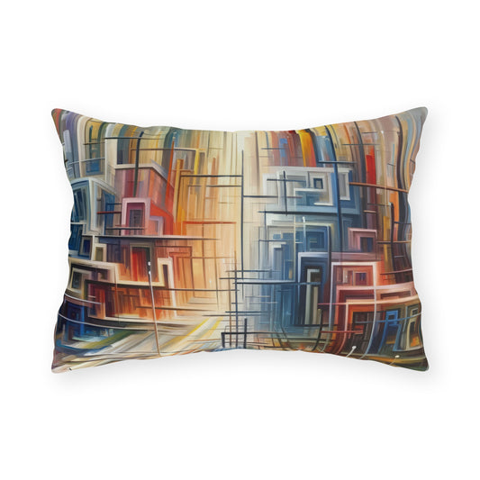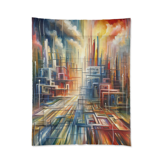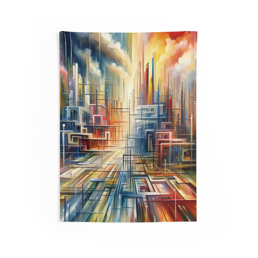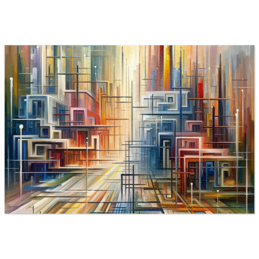 The artwork titled Urban Flow Interconnectedness unfolds as a vibrant, bustling cityscape rendered in a vertical Tachism style, symbolizing a return to our natural state of interconnectedness often concealed by the commotion of contemporary existence. In this dynamic composition, numerous vertical and horizontal lines intersect, giving the impression of a luminous network that connects various forms and structures, hinting at the underlying connectivity within a modern urban environment. Against the backdrop of a skyscape that transitions from warm reds and oranges at one end to cool blues and whites at the other, suggesting the movement of time from sunrise to sunset, a series of buildings appear stacked and arranged geometrically. These architectural forms feature a range of hues, including shades of turquoise, crimson, ochre, and beige, that encapsulate the diversity and energy of city life. The abstraction of the piece allows for a fluid interpretation, encouraging the viewer to delve beyond the immediate chaos and recognize the orderly patterns that exist amidst the perceived disorder. The convergence of lines and blurring of colors create a visual harmony, resonating with the innate human desire for connection and reflecting on the intrinsic collective fabric that weaves together the human experience within the urban landscape.