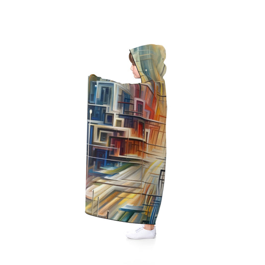 The artwork titled Urban Flow Interconnectedness unfolds as a vibrant, bustling cityscape rendered in a vertical Tachism style, symbolizing a return to our natural state of interconnectedness often concealed by the commotion of contemporary existence. In this dynamic composition, numerous vertical and horizontal lines intersect, giving the impression of a luminous network that connects various forms and structures, hinting at the underlying connectivity within a modern urban environment. Against the backdrop of a skyscape that transitions from warm reds and oranges at one end to cool blues and whites at the other, suggesting the movement of time from sunrise to sunset, a series of buildings appear stacked and arranged geometrically. These architectural forms feature a range of hues, including shades of turquoise, crimson, ochre, and beige, that encapsulate the diversity and energy of city life. The abstraction of the piece allows for a fluid interpretation, encouraging the viewer to delve beyond the immediate chaos and recognize the orderly patterns that exist amidst the perceived disorder. The convergence of lines and blurring of colors create a visual harmony, resonating with the innate human desire for connection and reflecting on the intrinsic collective fabric that weaves together the human experience within the urban landscape.