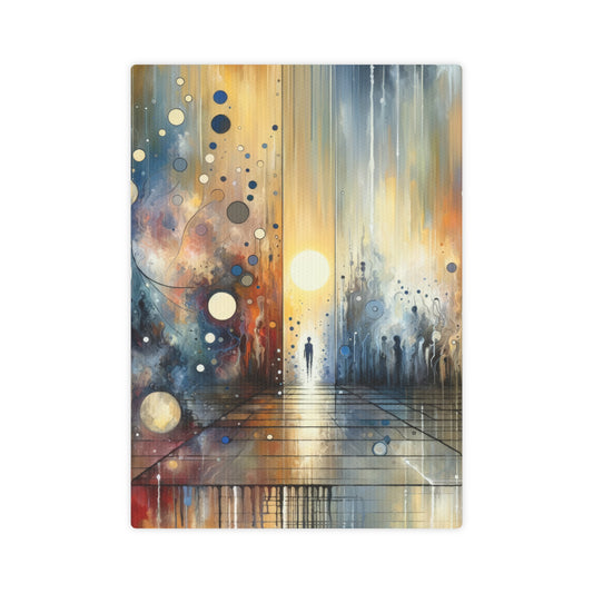 The image titled Stillness Transition Abstract is a vertical, Tachism style painting that symbolically represents the concept of finding tranquility within chaos and the potential for change. It showcases a striking interplay of colors and textures, with vertical streaks creating a feeling of both motion and stasis. A warm palette of oranges and reds on the left transitions into cool blues and grays on the right, depicting a spectrum of emotions or states of being. In the midst of this color gradient, a series of circles and orbs float upwards, akin to bubbles or celestial bodies, adding to the ethereal quality of the image. These shapes appear more concentrated around a central, brighter orb that resembles a sun or a source of light, evoking a sense of energy and focus. At the base of the composition is a reflective surface, a nod to stillness and introspection, which captures the painting s intense colors and shapes in its sheen. A solitary figure stands in this space, walking towards the light, suggesting a journey toward enlightenment or self-awareness. The figure s presence encourages the viewer to consider their own path and the moments of calm and insight that can emerge amidst life s ever-shifting narrative.