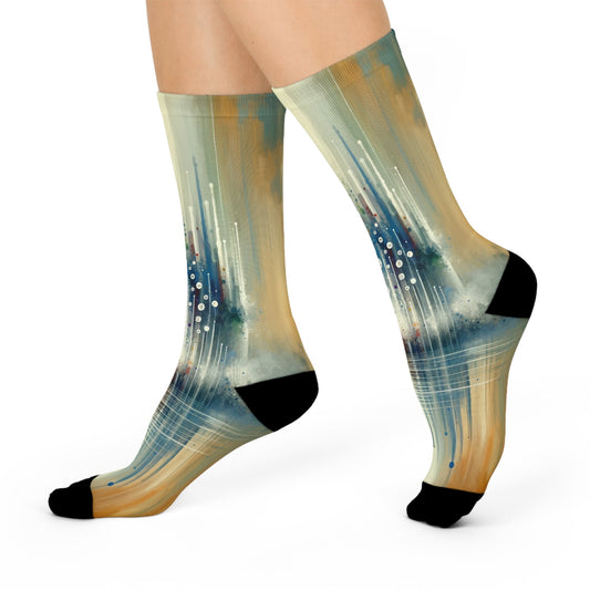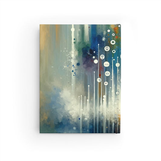 The image, titled Tachism Digital Escape, is a vertical, Tachism style abstract painting that symbolizes A Daily Dose of Digital Detox. The essence of the piece is to capture the concept of disconnecting from the digital world. The composition is centered around a cascade of vibrant, vertical streaks of paint that create a sense of movement and energy flowing downward, reminiscent of rain or a digital cascade. A myriad of symbols akin to those found in digital interfaces, such as buttons, gears, and icons, intersperse the composition, hinting at themes of technology and connectivity. These symbols seem to be caught in the downward motion, suggesting the shedding or release from the digital clutter that pervades daily life. The color palette is a warm blend of earthy tones, with shades of blue running through it, invoking a sense of water washing over or cleansing. Toward the bottom, these colorful impacts culminate in a reflective surface, an almost mirror-like effect that shimmers across the canvas, giving the impression of a tranquil body of water that captures and perhaps purges the elements from above. This artwork might evoke a range of emotional responses, including the tranquility associated with disconnecting from the constant demands of digital tools and the overwhelming sensation that sometimes accompanies our online presences. Overall, the painting embodies a visual journey of detoxification and renewal, encouraging contemplation and a break from the digital bonds.