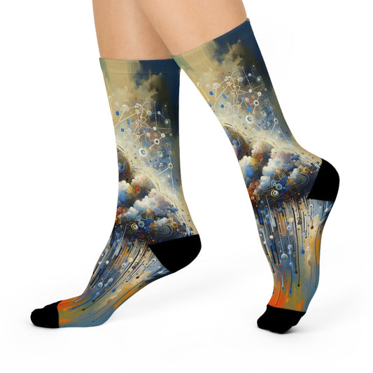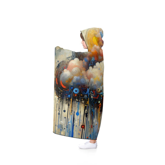 The image titled Cloud Community Crafting is a vertical painting that showcases the Tachism style, an abstract art movement characterized by spontaneous brushwork, drips, and blobs of color. This artwork symbolically represents the concept of building a community within the digital realm of the cloud. At the core of the artwork is a cluster of cloud-like formations, rendered with a dynamic mix of colors and textures that suggest a bustling, organic network. Shades of white, blue, and vibrant oranges and yellows create a sense of depth and movement, akin to the nebulous and ever-changing cloud infrastructure that supports virtual communities. This central motif of swirling clouds is surrounded and permeated by an array of abstract shapes and lines. Thin, vertical drips and elongated forms stretch downward from the clusters, reminiscent of data streams or the flow of information. Throughout the composition, symbolic representations of connectivity and network nodes appear as series of circles, lines, and abstract symbols, some resembling simplified icons associated with digital technology and social media. The overall effect conveys a sense of interconnectedness and fluidity, highlighting the dynamic and creative processes that underpin the formation and maintenance of communities in the digital cloud space. The painting captures the essence of collaboration and innovation, suggesting a world where relationships and ideas are continually crafted and reshaped within the boundless expanses of the cloud.