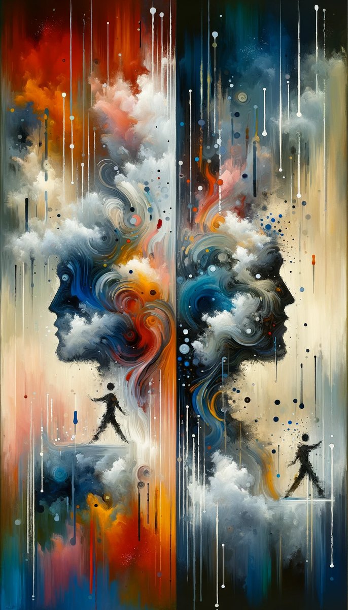 The image titled Connected Isolation Paradox is a vertical Tachism style painting conveying the complex theme of The Paradox of Connected Isolation. It embodies a juxtaposition of disconnection and unity, articulated through a visually tumultuous yet cohesive abstract expression. Central to this artwork are two silhouetted figures positioned at the bottom, separated by the painting s breadth yet connected through the mirrored tumult above them. These figures appear small and isolated against the grand chaos of colors and forms. Their juxtaposition alludes to the paradoxical experience of simultaneous separation and connection within the modern world. Dominating the canvas, a whirlwind of color and energetic brushstrokes create an intense and vibrant atmosphere. A cacophony of fiery reds, cool blues, and neutral whites and greys seem to both clash and harmonize. These pigments cascade like rain, linking the top and bottom of the painting with streaks that resemble both falling rain and shooting stars, further symbolizing the flow of connection and isolation. The most arresting feature is the presence of two implied faces emerging from the chaos, created by the clever use of negative space and contrasting colors, staring in opposite directions. They suggest the presence of humanity within the abstraction. This painting encapsulates the essence of contemporary life, where individuals can feel profoundly isolated despite being part of a densely interconnected society. The artwork powerfully interprets the invisible threads that both bind and separate individuals in the modern era.