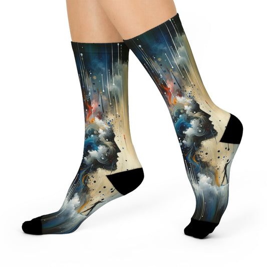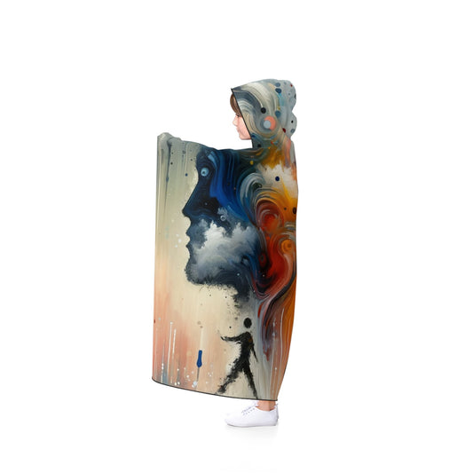 The image titled Connected Isolation Paradox is a vertical Tachism style painting conveying the complex theme of The Paradox of Connected Isolation. It embodies a juxtaposition of disconnection and unity, articulated through a visually tumultuous yet cohesive abstract expression. Central to this artwork are two silhouetted figures positioned at the bottom, separated by the painting s breadth yet connected through the mirrored tumult above them. These figures appear small and isolated against the grand chaos of colors and forms. Their juxtaposition alludes to the paradoxical experience of simultaneous separation and connection within the modern world. Dominating the canvas, a whirlwind of color and energetic brushstrokes create an intense and vibrant atmosphere. A cacophony of fiery reds, cool blues, and neutral whites and greys seem to both clash and harmonize. These pigments cascade like rain, linking the top and bottom of the painting with streaks that resemble both falling rain and shooting stars, further symbolizing the flow of connection and isolation. The most arresting feature is the presence of two implied faces emerging from the chaos, created by the clever use of negative space and contrasting colors, staring in opposite directions. They suggest the presence of humanity within the abstraction. This painting encapsulates the essence of contemporary life, where individuals can feel profoundly isolated despite being part of a densely interconnected society. The artwork powerfully interprets the invisible threads that both bind and separate individuals in the modern era.