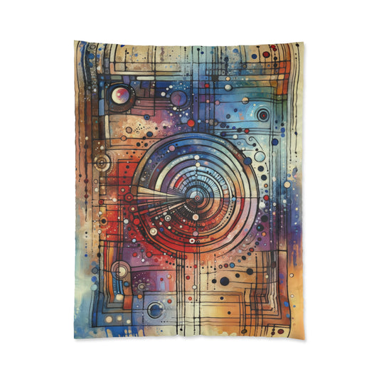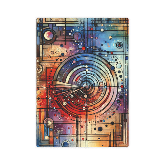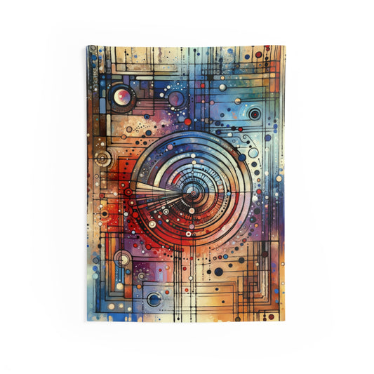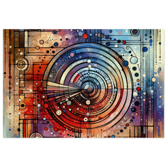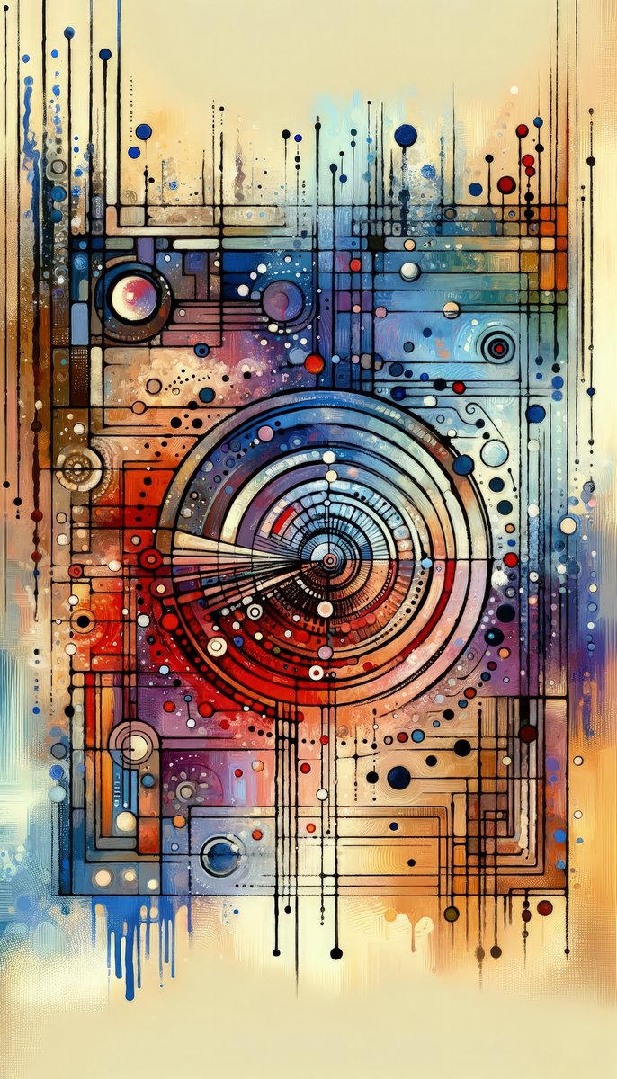 The artwork titled Rituals Over Routines is a vibrant, Tachism style vertical image, evoking the essence and juxtaposition between the concepts of rituals and routines . The dominant visual is a concentric circle that draws the eye toward its center, symbolizing a focal point or perhaps an altar of ritualistic significance. This centerpiece is surrounded by various geometric shapes, lines, and patterns that seem meticulously arranged, hinting at the concept of routines. The colors used transition from cooler blues on the right, implying a sense of calm and perhaps the mundane, to warmer reds and oranges on the left, which could represent the fervor and passion associated with rituals. The backdrop features splatters and drips, characteristic of the Tachism art movement, which could indicate a transcendence from order to a more fluid and expressive state. These spills and spots break through the organized patterns, suggesting a disruption of routine by the spontaneous and meaningful nature of rituals. The overall composition uses a rich palette of colors, and a contrasting combination of order and chaos, creating a sense of movement from the structural to the spiritual, effectively depicting the transition from repetitive daily routines to rituals that provide deeper, more introspective value to life.