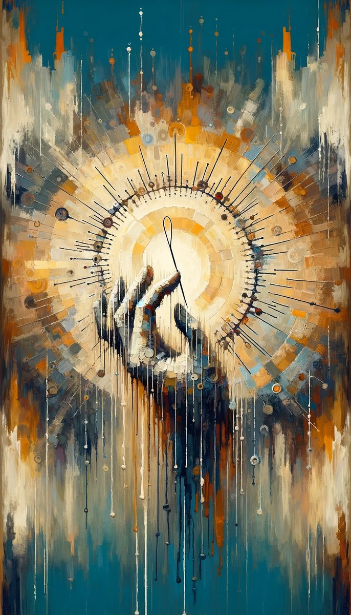 Sovereign Reflective Tachism is a vertical image painted in the Tachism style that symbolically represents the concept of Sovereign Reflectivity. The painting features a mesmerizing array of colors, predominantly in shades of blues, oranges, and whites. At the center, there is a bright, radiating circle resembling a sun or an eye that immediately commands attention. Around this circle, numerous linear elements with small circular motifs project outward, creating a sensation of an explosion of light or energy. Below the central circle, the colors cascade downwards like rain or tears, blending into each other and forming a background that appears both chaotic and harmonious. The frayed edges and worn patches throughout the painting suggest a history of decay or transformation, providing a stark contrast to the vibrant center. The overall effect is one of introspection and contemplation, as if the viewer is invited to reflect on the power and authority within themselves, amidst the disintegration of external structures. The Tachism technique gives the piece a sense of immediacy and raw emotion, emphasizing movement and the physical act of painting. The artwork engages the audience in a silent dialogue about the fragility and resilience of the human spirit and the notion of inner sovereignty against the backdrop of an ever-changing world.