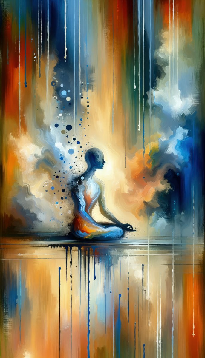 The image titled Resonance Abstract Healing is a captivating Tachism style abstract painting that visually conveys the notion of healing. The artwork masterfully utilizes a wide range of vibrant colors and organic forms to create a composition that is both dynamic and harmonious. At the center of the composition sits a tranquil figure in a meditative pose. This figure is rendered with gentle, flowing contours that blend seamlessly with the surrounding colors, suggesting a deep connection between the individual and the healing energies around them. The figure s silhouette appears to be in a state of tranquility, embodying the essence of inner peace and healing. Above and around the figure, a myriad of colors explode in a cosmic display. Warm hues of orange, yellow, and red intermingle with cool tones of blue and aqua, while white accents give the impression of light and energy. Streaks of paint drip down the canvas, creating an effect that is both orderly and spontaneous, mirroring the unpredictable nature of the healing process. Beneath the meditating figure, the colors reflect onto a glossy surface, suggesting water or a mirror, which adds depth to the painting and conveys the idea of self-reflection as a part of the healing journey. Overall, the artwork encapsulates a visually rich interpretation of healing s resonance, inviting viewers to ponder the abstract interplay of color, form, and emotion.