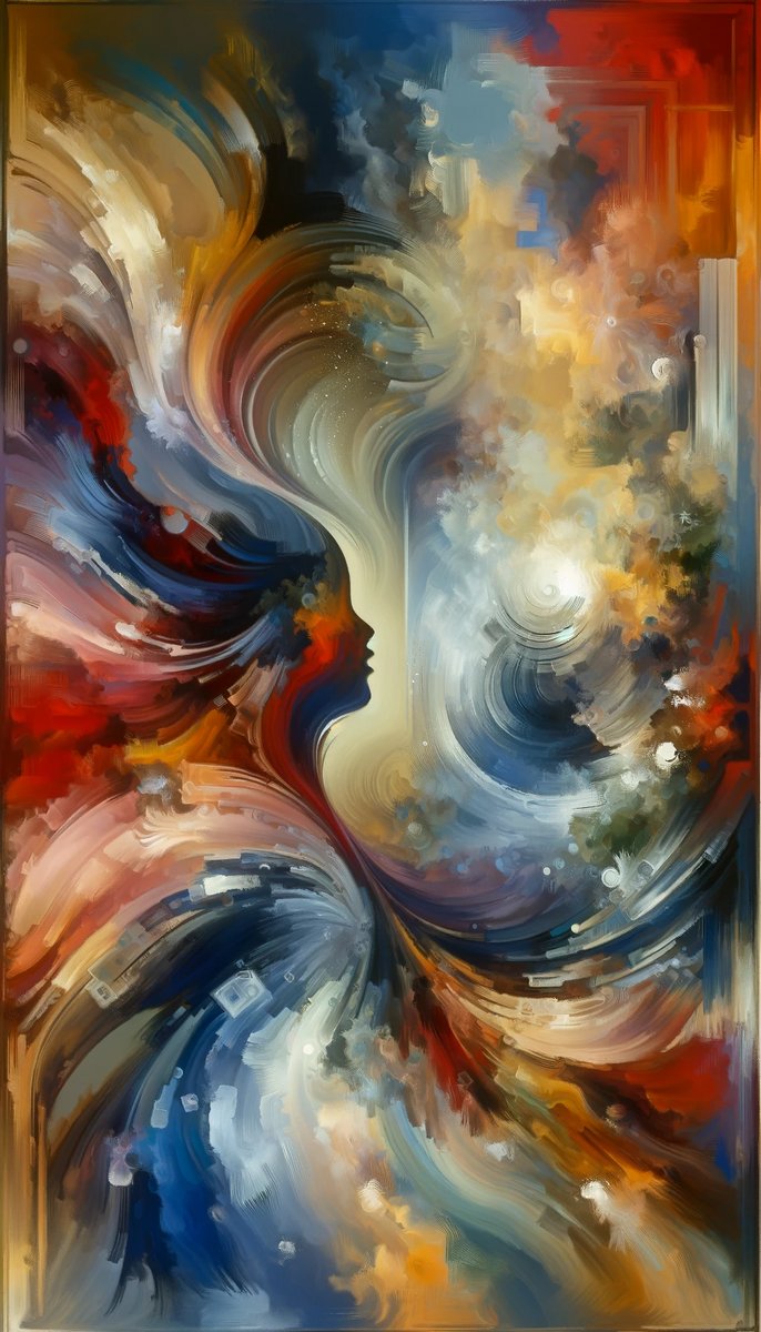 The artwork titled Embracing Sovereign Reflectivity is a vertical image rendered in a Tachism style, reflecting an abstract and fluid melding of colors and forms. Dominated by a whirlpool of brushstrokes that spiral toward the center, the image is vivid with a dynamic range of hues, from deep blues and fiery reds to gentle pastels and earthy browns. At the heart of this visual maelstrom are the silhouettes of two human profiles facing away from each other, their outlines merging seamlessly with the swirling patterns that envelop them. These profiles suggest an intimate connection despite their opposing directions, embodying the concept of self-reflection and individual sovereignty even within close relationships or interconnected systems. The painting s composition is atmospheric and evocative, with the fluidity of the strokes creating a sense of movement and transformation. Light seems to emanate from the central axis of the image, lending an ethereal and almost mystical quality to the scene. The use of contrasting warm and cool tones as well as areas with higher saturation against more muted sections adds to the complexity and depth of the piece, inviting viewers to both an emotional and intellectual engagement with the abstract representation. Embracing Sovereign Reflectivity is a work that captures the essence of introspection and the exploration of one s own consciousness, depicted through the lens of abstract expressionism and Tachist art.