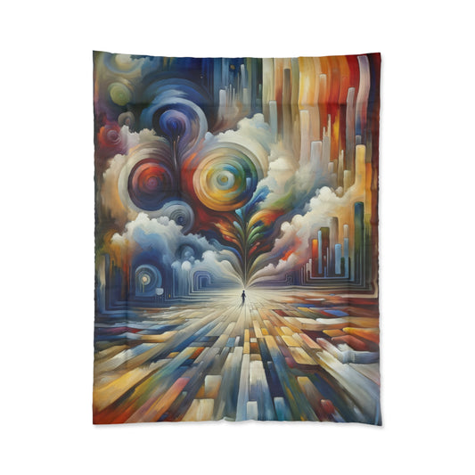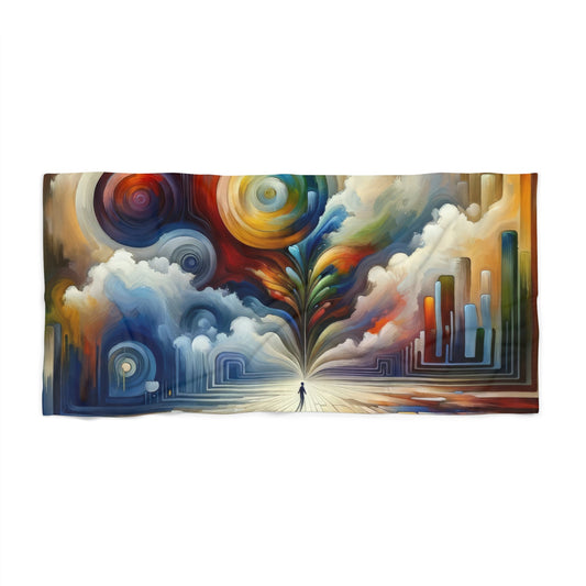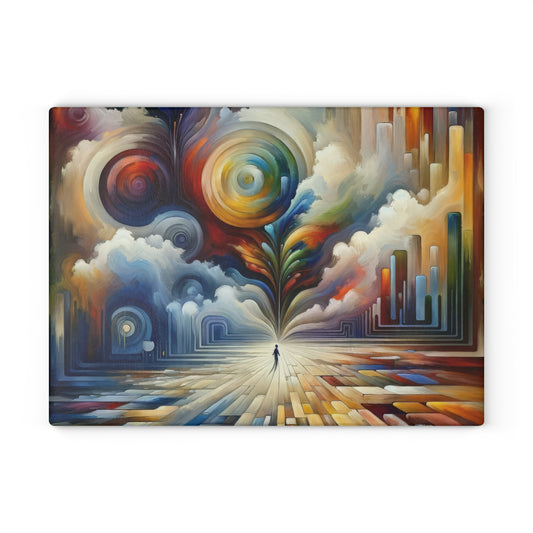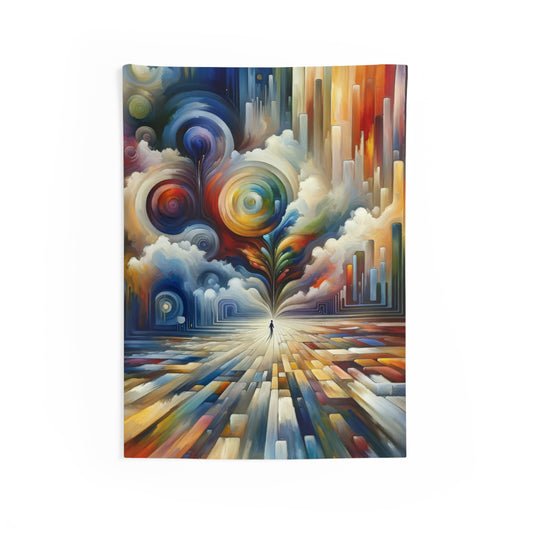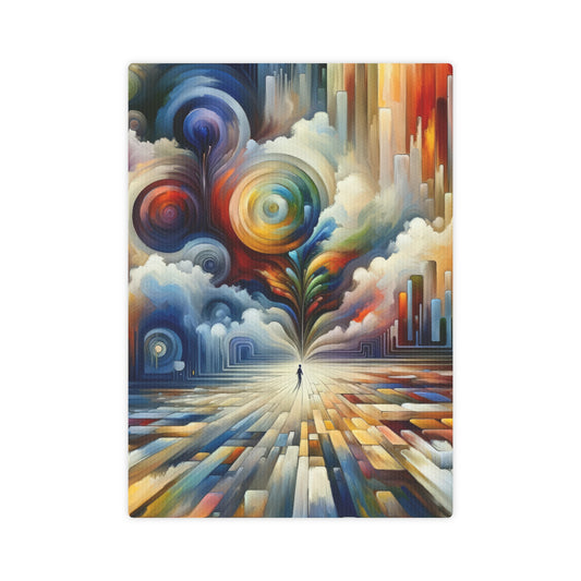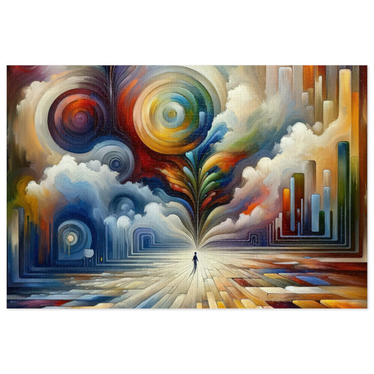 Sensory Thought Awakening captures a vibrant journey into the abstract realms of the mind s sensations and the heart s emotional emergence. The vertical Tachism style painting portrays an explosion of colors and shapes, creating a visual representation of internal landscapes teeming with depth and complexity. At the core of the artwork, a stunning spectrum of tones and hues radiate outward, suggesting the infinite scope of human thought and feeling. Vibrant and contrasting colors coalesce to form organic swirls and geometric patterns, giving the impression of a boundless and dynamic inner world. These elements converge toward the center where a lone figure stands at the convergence point of linear paths that extend to the horizon. The figure is silhouetted against the striking bursts of color, serving as a poignant symbol of personal reflection and the solitary nature of introspection. Cloud-like formations and textural gradations evoke an ethereal quality, as if the painting itself breathes with the life of subconscious thoughts and dream-like visions. The piece is designed to pull the viewer into a meditative state, contemplating the interconnectedness of sensory experiences and emotional awakenings. It is an invitation to lose oneself in the vastness of one s inner psyche and the myriad pathways leading to enlightenment and self-discovery.