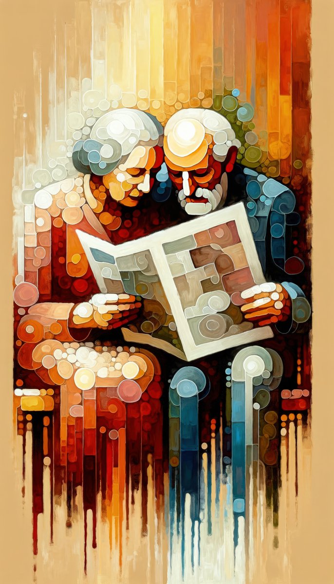 The image titled Elderly Unity Tachism is a vertical piece, created in the Tachism style, which is an artistic movement characterized by using splotches, blobs, and drips of color to create an image. The painting embodies a mesmerizing blend of warm and cool tones that come together to form the tender scene of an elderly couple sharing a newspaper. In this symbolic representation, their unity and closeness are emphasized by their heads bowed together in a gentle and affectionate gesture. Their bodies merge into a vivid array of shapes and colors that suggest a lifetime of shared experiences and emotions. The artwork s background fades from a warm, golden hue at the top, down to a paler cream color at the base, giving the impression of a surrounding glow that highlights the couple. Their clothing and the newspaper are composed of vibrant, overlapping forms and circles, signifying the complexity and richness of their lives. The painting s textures and colors appear to be in a state of flux, as if the paint itself is dripping down the canvas, creating a dynamic, yet harmonious effect, that captures the passage of time and the enduring connection between the two figures. It is a visual testament to the depth of their companionship.