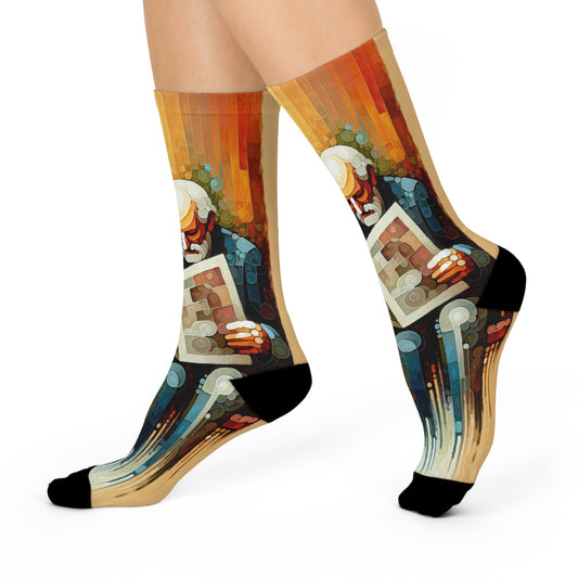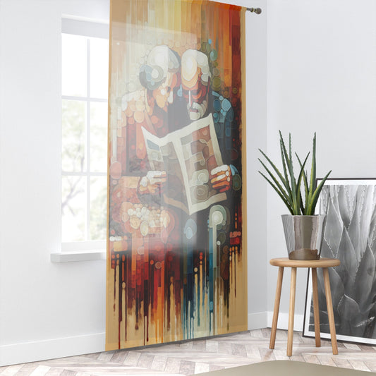 The image titled Elderly Unity Tachism is a vertical piece, created in the Tachism style, which is an artistic movement characterized by using splotches, blobs, and drips of color to create an image. The painting embodies a mesmerizing blend of warm and cool tones that come together to form the tender scene of an elderly couple sharing a newspaper. In this symbolic representation, their unity and closeness are emphasized by their heads bowed together in a gentle and affectionate gesture. Their bodies merge into a vivid array of shapes and colors that suggest a lifetime of shared experiences and emotions. The artwork s background fades from a warm, golden hue at the top, down to a paler cream color at the base, giving the impression of a surrounding glow that highlights the couple. Their clothing and the newspaper are composed of vibrant, overlapping forms and circles, signifying the complexity and richness of their lives. The painting s textures and colors appear to be in a state of flux, as if the paint itself is dripping down the canvas, creating a dynamic, yet harmonious effect, that captures the passage of time and the enduring connection between the two figures. It is a visual testament to the depth of their companionship.