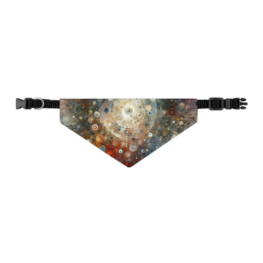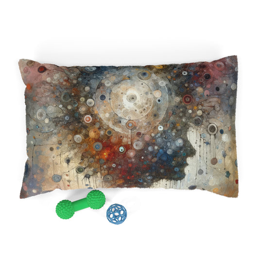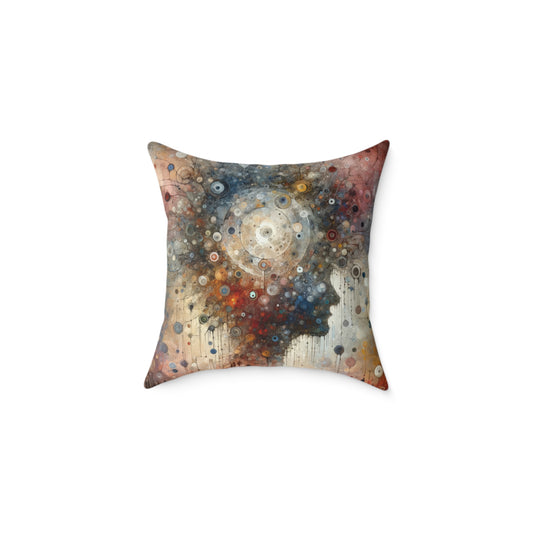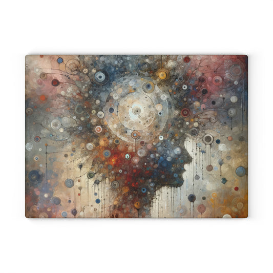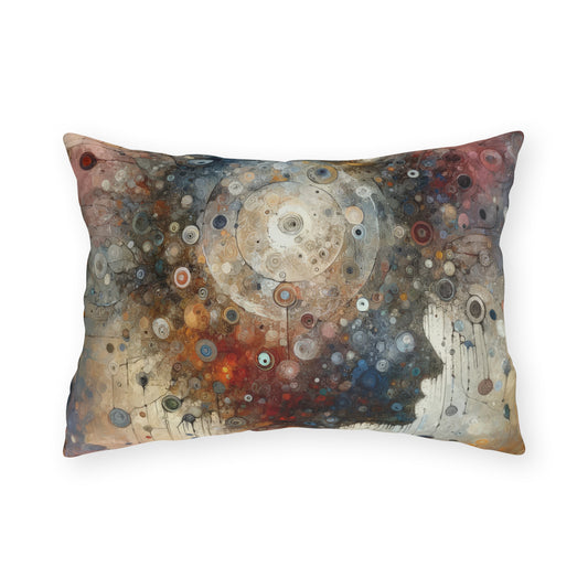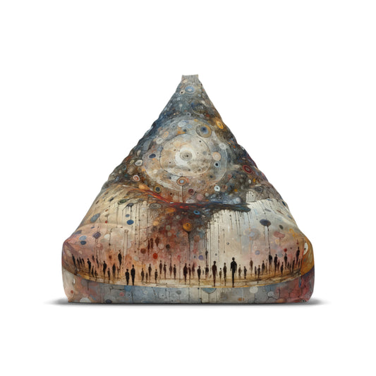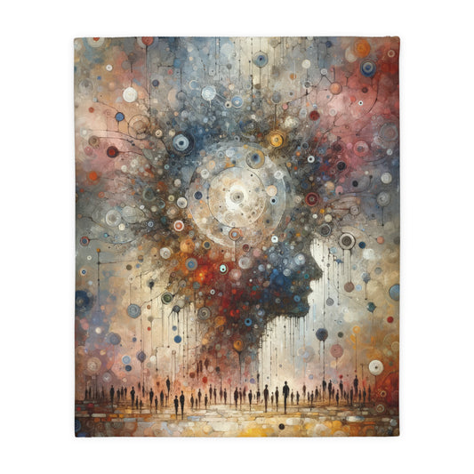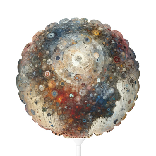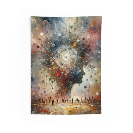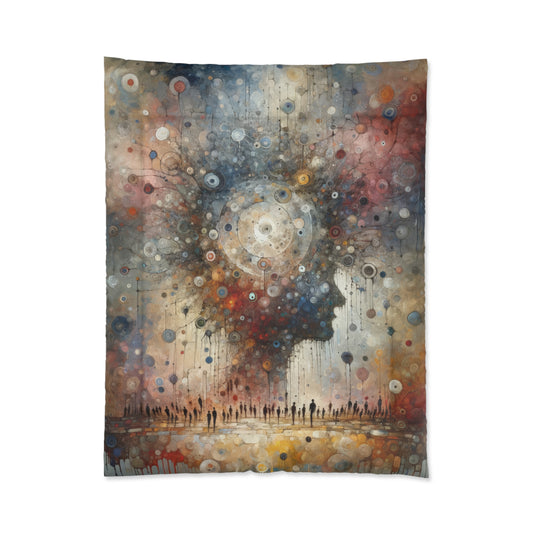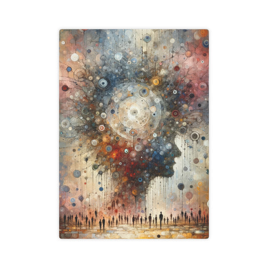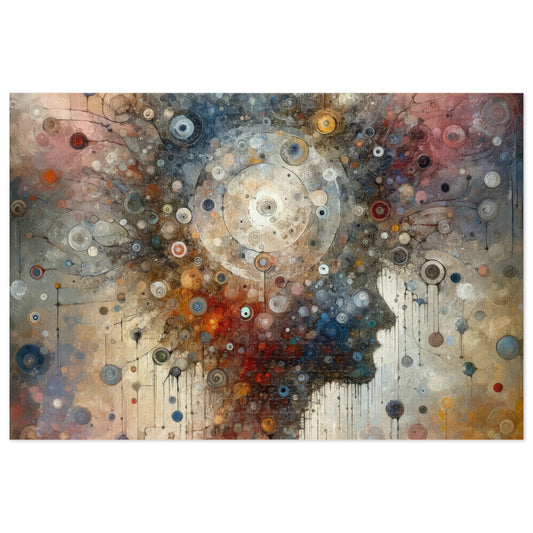 The image titled Shared Existence Solace is a vertical artwork in the Tachism style, which is a form of abstract painting characterized by splotches and dribbles of color, rather than defined lines or shapes. This piece uses a myriad of overlapping circles in various sizes and colors, forming a complex mosaic of pattern and hue. At the top, the circles are dense and layered with cool tones of blue, gray, and white, evoking a sense of infinite space or celestial bodies. As the eye travels downward, the circles become warmer, introducing reds, oranges, and yellows, mixing and melding in a dynamic play of light and texture. The bottom region introduces silhouetted figures of people standing side by side, stretching across the width of the piece. They appear reflective and contemplative, gazing into or across the vibrant array that unfolds above them. This human element symbolizes the shared existence referenced in the title and suggests a connection between individuals, with each figure potentially representing a unique universe of thought and experience. Their reflections ripple gently beneath them on what appears to be a glossy surface, echoing the motifs above and suggesting a world both real and imagined. The artwork seems to speak to the solace found in the communal experience, the comfort gleaned from knowing we are not alone in our vast, shared existence.