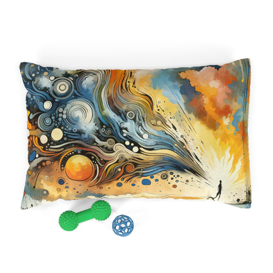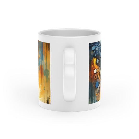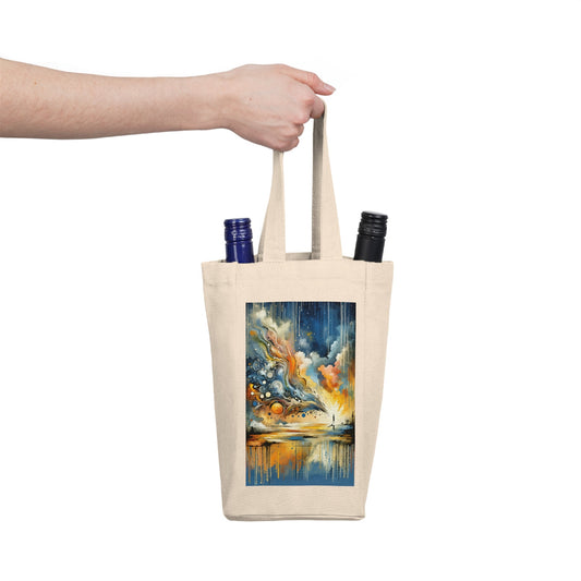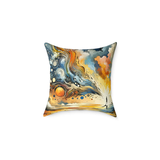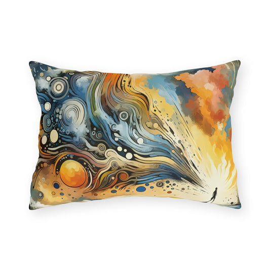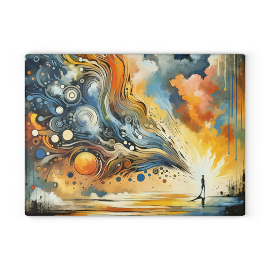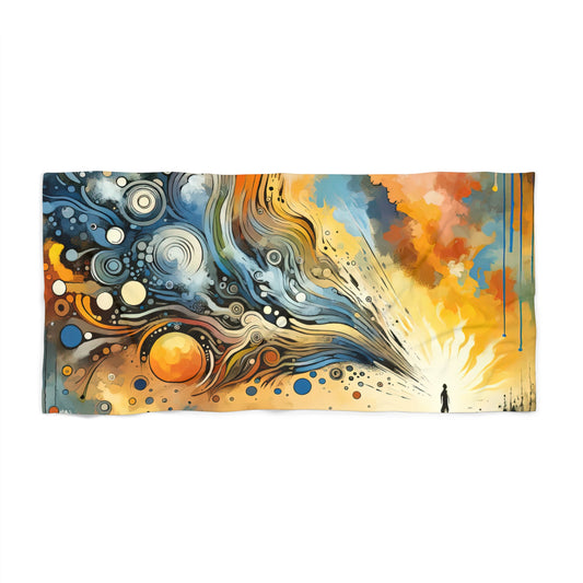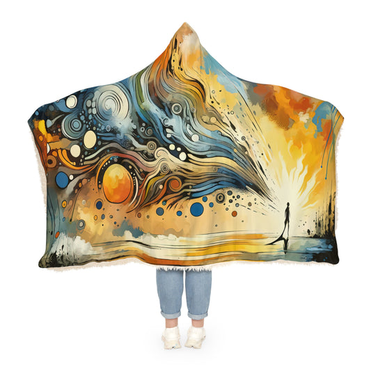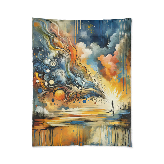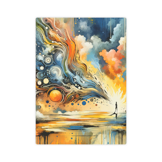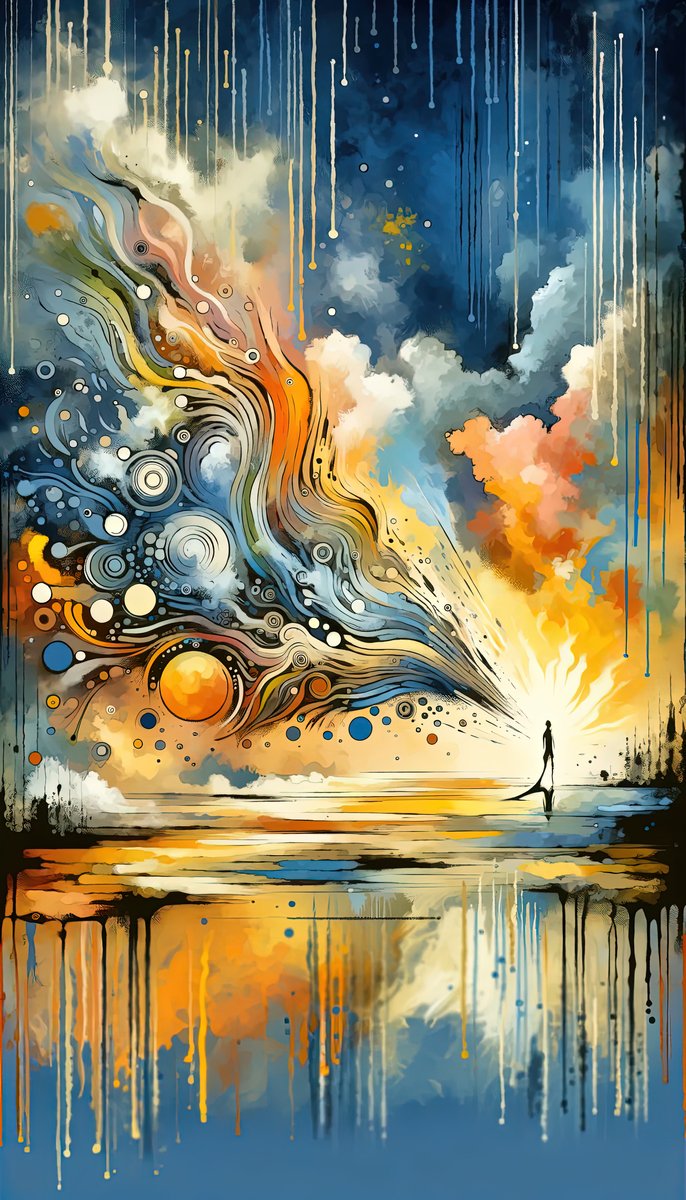 Intentional Awakening Reflection is a vertical image that encapsulates the ethereal essence of starting a day with purpose and understanding. In the style of Tachism, the artwork is a profound visualization of inner awakening, manifested as a dynamic and fluid interplay of colors and shapes. The painting bursts forth with a kaleidoscope of blues, golds, and whites, framing the central motif of a solitary figure standing at the edge of a reflective body of water. This figure, perhaps a representation of the self, seems to be gazing into the distance or into the heart of the sunrise, embodying a moment of profound insight. Above the figure, an intense convergence of swirling patterns and spherical forms suggests the complex dance of thoughts and emotions. At the same time, bright droplets and streaks descend from the heavens like rain or beams of enlightenment, connecting the skies to the earth and the individual. The image portrays a celestial sun amidst this torrent of color and movement, casting a warm, life-giving light across the scene. Below, the mirror-like surface of the water doubles this spectacle, creating a symmetry between the internal and the external, the conscious and the subconscious. The horizon melds the water and sky, blurring the boundaries and implying the limitless possibilities that come with intentional reflection and awakening. The blend of abstraction and symbolism in this image invites the viewer to meditate on their own journey of awareness and purpose.