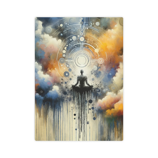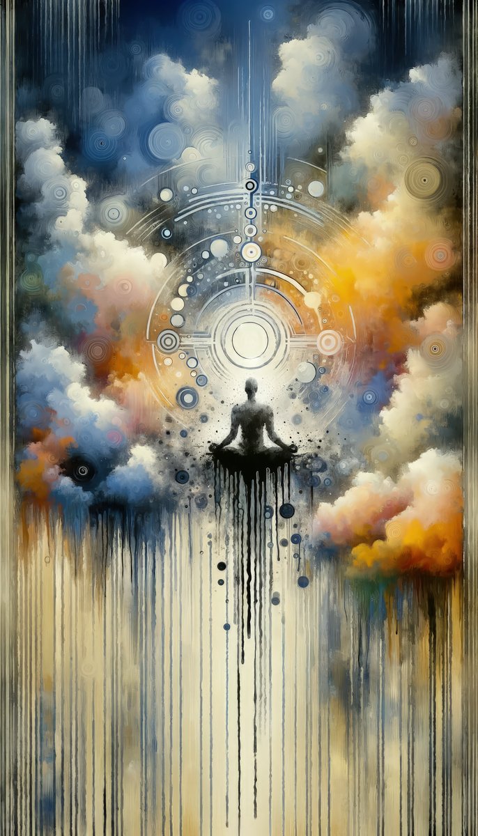 Titled Mindful Transformation Profundity, this vertical image is a visual representation of the spiritual concept of elevating the ordinary to the extraordinary through focused awareness. The artwork adopts a Tachism style, characterized by splotches, drips, and an explosion of colors that defy structure in a free-flowing manner. At the core of the piece sits a human figure in a meditative pose, seeming to float within an ethereal realm. This figure becomes the anchor amidst the chaotic beauty surrounding them. Above, an intricate celestial design radiates from the meditator s location, suggesting an awakening or enlightenment, with circular motifs and runic-like symbols that hint at a metaphysical journey. Dark and light blues mix with clouds of whites in the upper section, creating a soothing yet mysterious atmosphere. There s a subtle transition into warm, fiery oranges and yellows near the center, symbolizing a vibrant transformation. These vivid colors mirror the journey of mindfulness—starting from the cool calmness of contemplation, erupting into the luminous realization of inner profundity. The artwork is bordered by streaks of color that drip downwards, conveying movement and the fluidity of time. These long drips merge with the wooden texture at the bottom, grounding the nebulous, otherworldly experience into something tangible. It adeptly captures the ephemeral nature of transformation—one mindful moment leading to profound change.