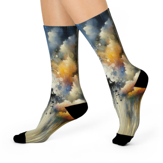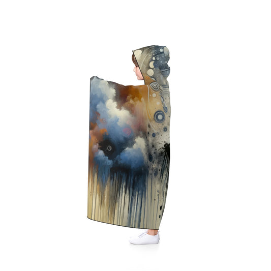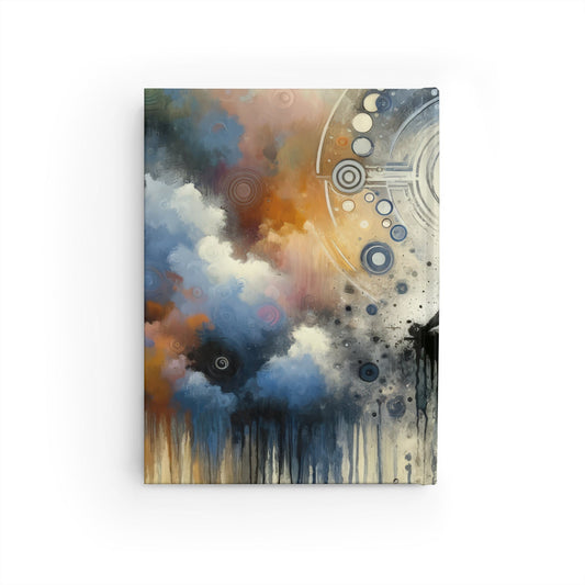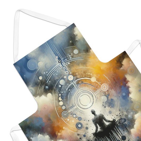 Titled Mindful Transformation Profundity, this vertical image is a visual representation of the spiritual concept of elevating the ordinary to the extraordinary through focused awareness. The artwork adopts a Tachism style, characterized by splotches, drips, and an explosion of colors that defy structure in a free-flowing manner. At the core of the piece sits a human figure in a meditative pose, seeming to float within an ethereal realm. This figure becomes the anchor amidst the chaotic beauty surrounding them. Above, an intricate celestial design radiates from the meditator s location, suggesting an awakening or enlightenment, with circular motifs and runic-like symbols that hint at a metaphysical journey. Dark and light blues mix with clouds of whites in the upper section, creating a soothing yet mysterious atmosphere. There s a subtle transition into warm, fiery oranges and yellows near the center, symbolizing a vibrant transformation. These vivid colors mirror the journey of mindfulness—starting from the cool calmness of contemplation, erupting into the luminous realization of inner profundity. The artwork is bordered by streaks of color that drip downwards, conveying movement and the fluidity of time. These long drips merge with the wooden texture at the bottom, grounding the nebulous, otherworldly experience into something tangible. It adeptly captures the ephemeral nature of transformation—one mindful moment leading to profound change.