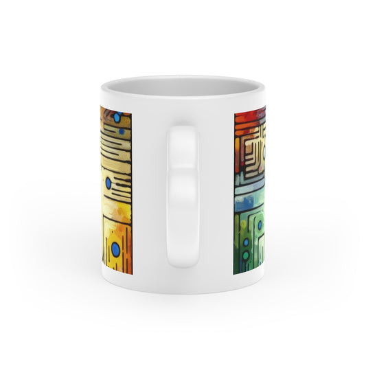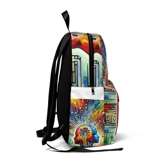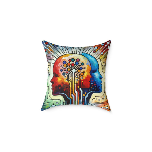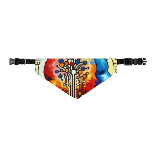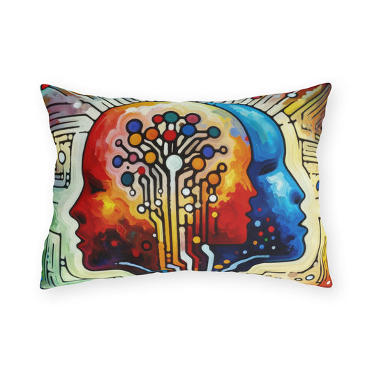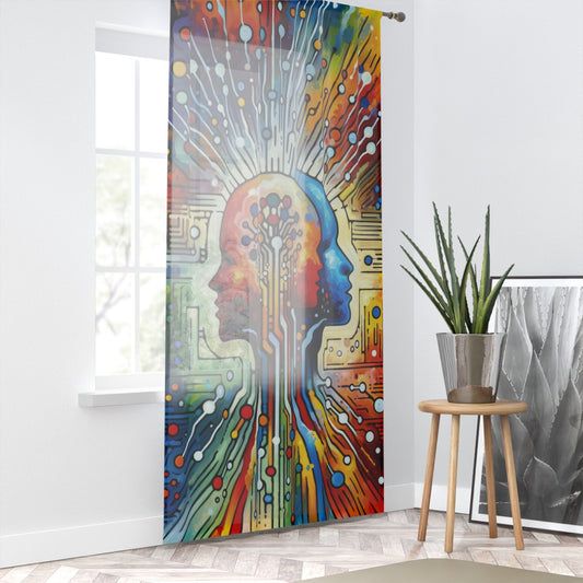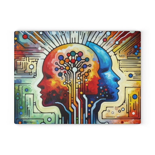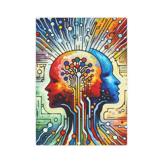 Titled Empathetic Connection Abstract, this vertical image is a vibrant and colorful representation in the style of Tachism, embodying the symbolic theme of Dialogues of the Heart: Empathy as Life s Lingua Franca. At its core, the artwork features an abstract depiction of two silhouetted profiles facing each other against an explosion of circuit-like patterns and bold splashes of paint that suggest an intricate network of communication and understanding. The profiles are outlined in a stark black that contrasts sharply with the radiant oranges, blues, reds, and yellows that fill the composition, possibly signifying the warmth and complexity of human emotions. Connecting the two silhouettes is a tree-like structure with multicolored circles as leaves, which merges with the circuit-like designs emanating from both figures, perhaps illustrating the intricate and interconnected nature of empathetic exchanges. The background, filled with streaks of colors ranging from warm to cool tones, reinforces the dynamism of the image. The use of bright white highlights and dots creates a sense of energy and movement that radiates outward from the center. It appears as if the emotional and intellectual exchange between the two entities is bursting forth into the world, underscoring the transformative power of empathy and emotional connection in human interaction.