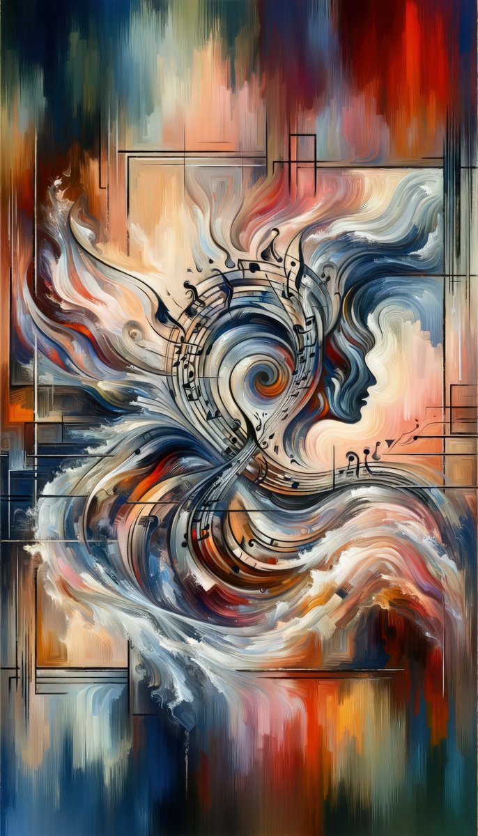 Titled Symphonic Empathic Swirls, this Tachism-style painting beautifully embodies the Symphony of Sympathy in a vertical format. The artwork bursts with kinetic energy through its use of abstract, flowing forms and a whirlpool of colors blending together, symbolizing the harmony and emotional resonance of a symphony. Central to the image is a spiral suggestive of sound waves or music unfurling into the surrounding space, with lines and shapes reminiscent of musical staffs and notes. These coils and curves lace into one another, representing the interconnectivity of human emotions as they are inspired and shared through the medium of music. This spiral is framed by a multitude of layered brushstrokes, marrying warm oranges and reds with cool blues and whites, creating a vibrant tapestry that visually pulsates with vibrancy. Occasionally, the outlines of humanoid figures appear to be engaging with or emerging from the torrent of shapes and shades, symbolizing our intrinsic relationship with music and its power to evoke empathy. The contrasting mix of elements also hints at the complex layers of feelings and relations, with none being clearly defined or static. Altogether, the painting invites viewers to feel the emotional depths and connections that music can inspire, all without the use of words, letters, or explicit writing, allowing the visual symphony to speak directly to the soul.