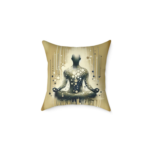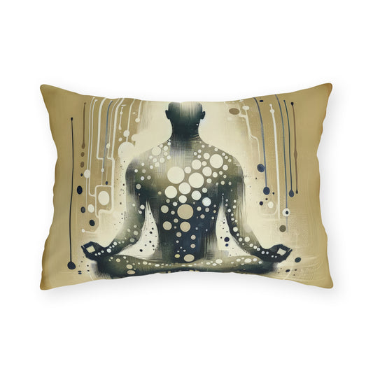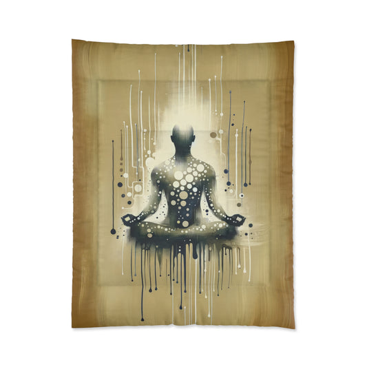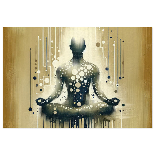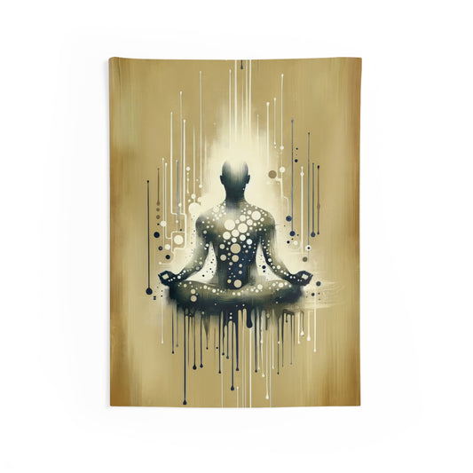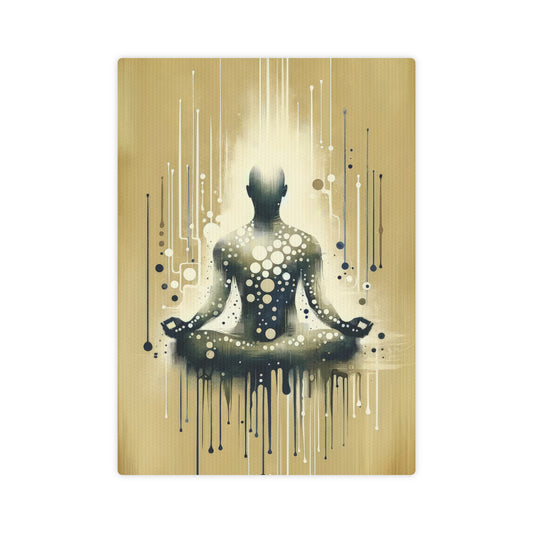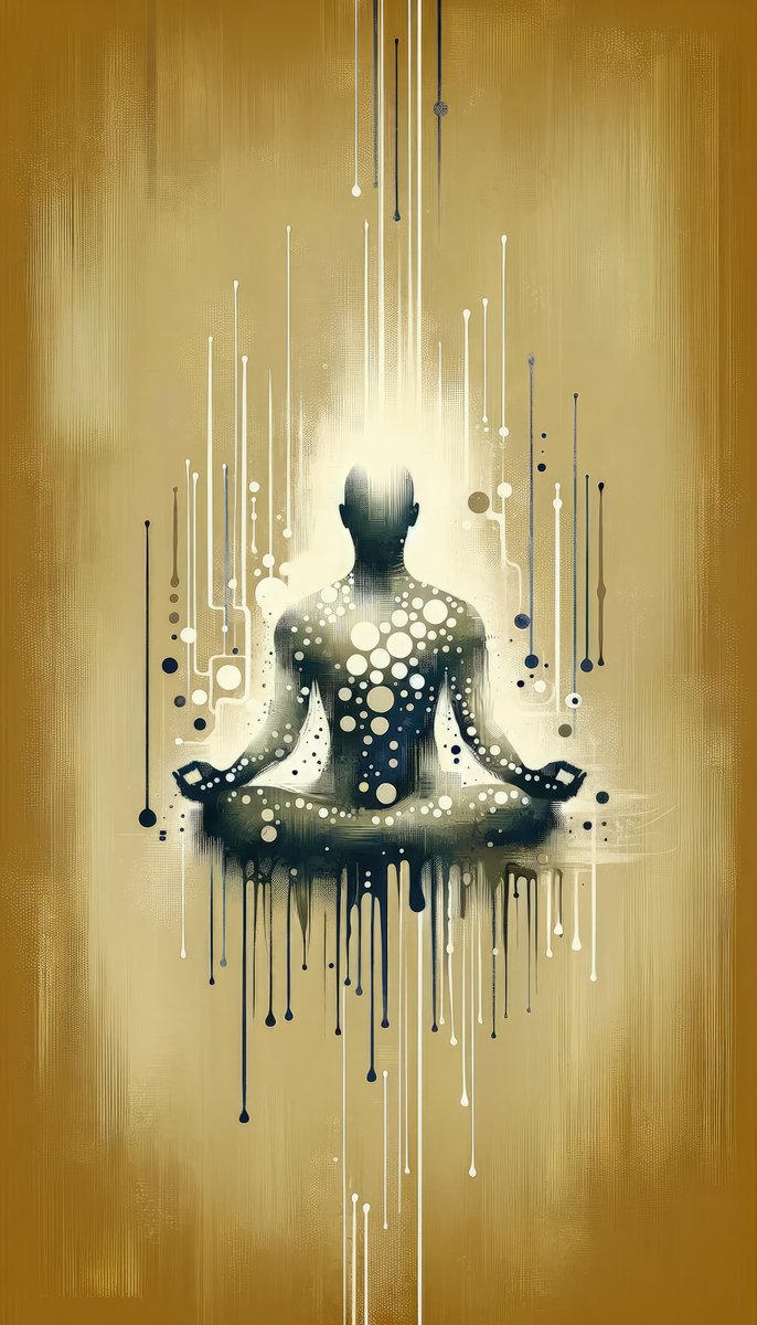 The image titled Breath Essence Beginning presents an entrancing, vertical depiction in a Tachism style, symbolically representing the concept of beginning with conscious breathing. At the core of the artwork is the silhouette of a figure in a meditative pose. The figure s seated form is both central and part of the surrounding imagery, suggesting an interconnectivity with the essence of breath. This figure is rendered in a monochrome palette, allowing for a multitude of white and dark dots that appear to emerge from or converge into the body, illustrating the flow and exchange of energy associated with breathing. The background is awash with a warm, golden hue, evoking a sense of serenity and focus. Intriguingly, the artwork is enriched with vertical drips and elongated splatters of paint, ranging from stark white to deep blues and blacks. These elongated elements suggest rain or the downward flow of energy. Some of these drips arise from the figure itself, further reinforcing the theme of connectivity and the cyclical nature of breath—from the internal to the external world and back again. The amalgamation of the serene central figure and the dynamic, abstract elements surrounding it creates a harmonious and thought-provoking visual metaphor. It invites the viewer to reflect on the grounding power of breath and the tranquil beginnings it can inspire.