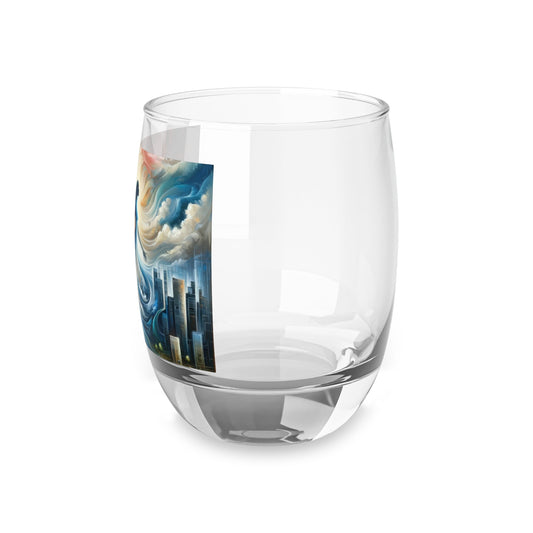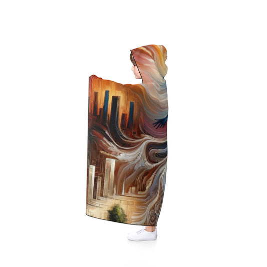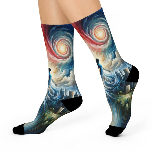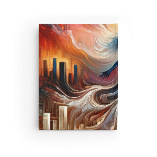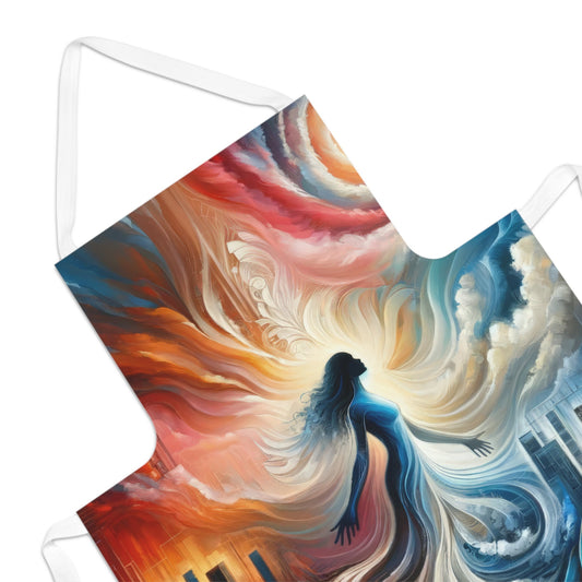 Titled Transformative Tachism Emergence, this vertical painting vibrantly captures the symbolic metamorphosis of a practical woman transitioning from the objective world to a realm of spiritual awakening. At the core of the composition is a silhouetted female figure with flowing hair and gown, blending seamlessly with the surrounding elements, embodying the very essence of transformation. The left side of the painting depicts a cityscape swallowed by a whirlwind of fiery hues, symbolizing the chaotic, structured, and perhaps oppressive nature of a reality once dominated by rigid materialism. As the eye moves to the right, the scene morphs into calming shades of blue with another cityscape cradled by waves and clouds, representing the newfound peace and adaptability in the woman s perspective. Above her, the sky swirls into a hypnotic vortex, drawing a stark contrast between the warm and cool color palettes, which echo the internal struggle and harmony of change. The swirling patterns throughout the artwork suggest a dynamic fluidity and a relinquishment of control—a hallmark of Tachism, where emotion and spontaneity reign over precision. Encapsulating her are various patterns and textures that create a visual symphony, each brushstroke contributing to the story of her evolution. Trees line the bottom of the scene, grounded yet reflecting into water, alluding to a reflected consciousness and deep introspection. The overall image is one of profound change and the embracing of a more fluid, enlightened existence.