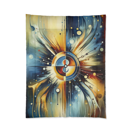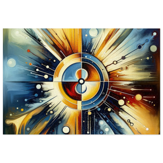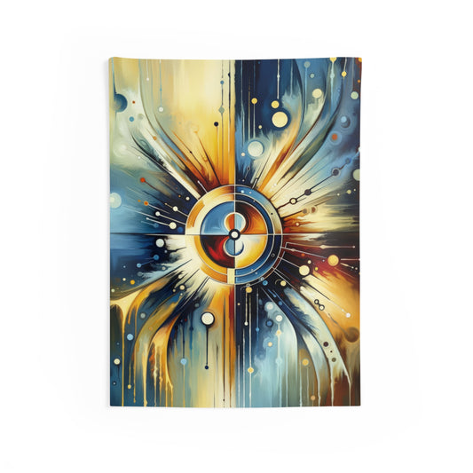 Compassionate Ethical Guidance is a striking vertical image rendered in Tachism style, infused with a vivid expression of color and form, symbolizing the concept of empathy as the guiding force in ethical interactions. At the heart of the artwork, a central compass-like motif radiates outward, creating a powerful focal point that anchors the viewer s gaze. The compass is composed of layered circles, with a gradient of warm hues shifting from a bright yellow to a deep crimson at its core, suggesting a beacon of moral clarity in a complex world. The surrounding area bursts with dynamic strokes and drips, evoking a sense of fluid motion and energy. Warm golden and cool blue tones divide the background, symbolizing the balance between compassion (warmth) and reasoning (coolness) in ethical decision-making. White splotches, dots, and lines scatter across the canvas like stars or distant beacons, signifying the myriad of influences and choices one encounters when navigating moral landscapes. This piece appears to converge the emotional and the rational, inviting the viewer to contemplate the importance of empathetic understanding as an ethical compass._abstract, and emotionally resonant, it encourages reflective thoughts on the role that empathy plays in guiding principled and humane actions amongst individuals and within societies.